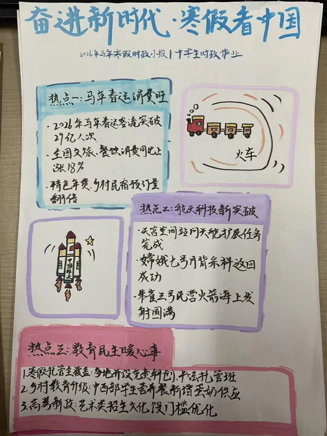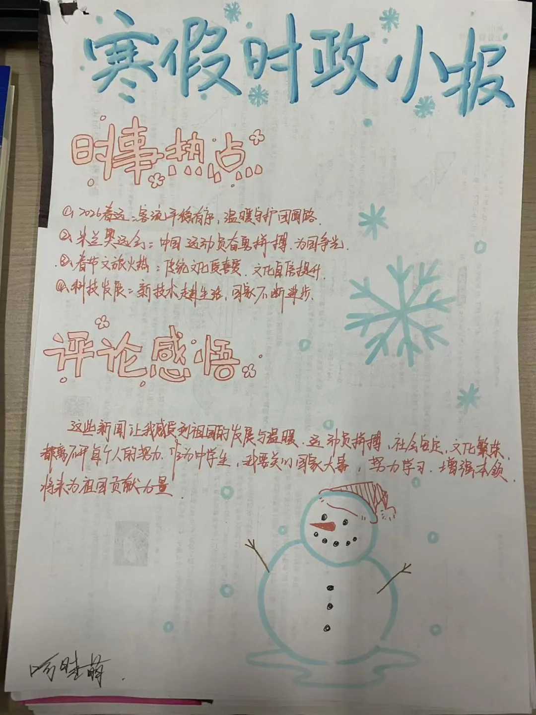 道德与法治是综合性学科,需要培养学生的时政意识,在寒假期间学生七年级学生利用网络搜集时政小知识,自己做成时政小报,通过此次活动提高学生的关心国家大事的意识,是培养学生综合素养、家国情怀的综合实践。