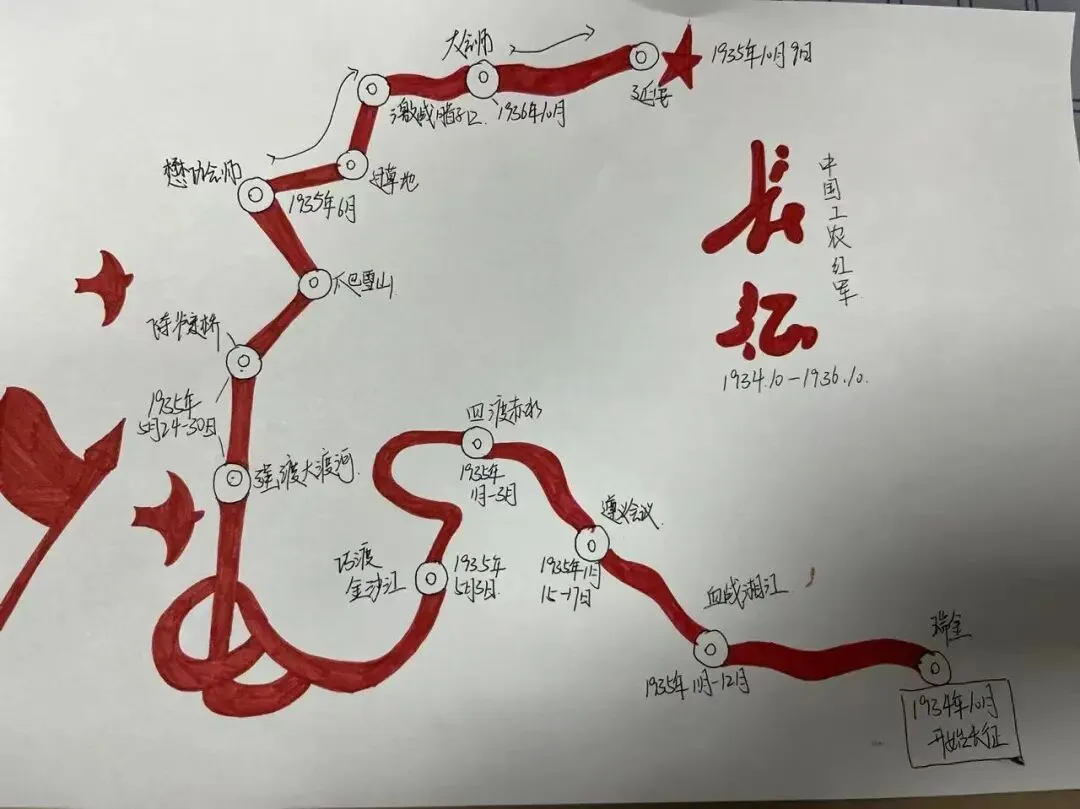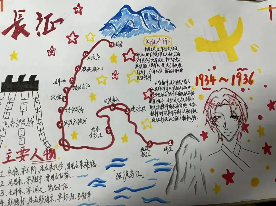 九年级同学们以画笔勾勒长征路线,标注关键战役与会议,图文并茂地展现了红军的英雄史诗。这不仅是对历史知识的巩固,更是一次深刻的红色精神洗礼。