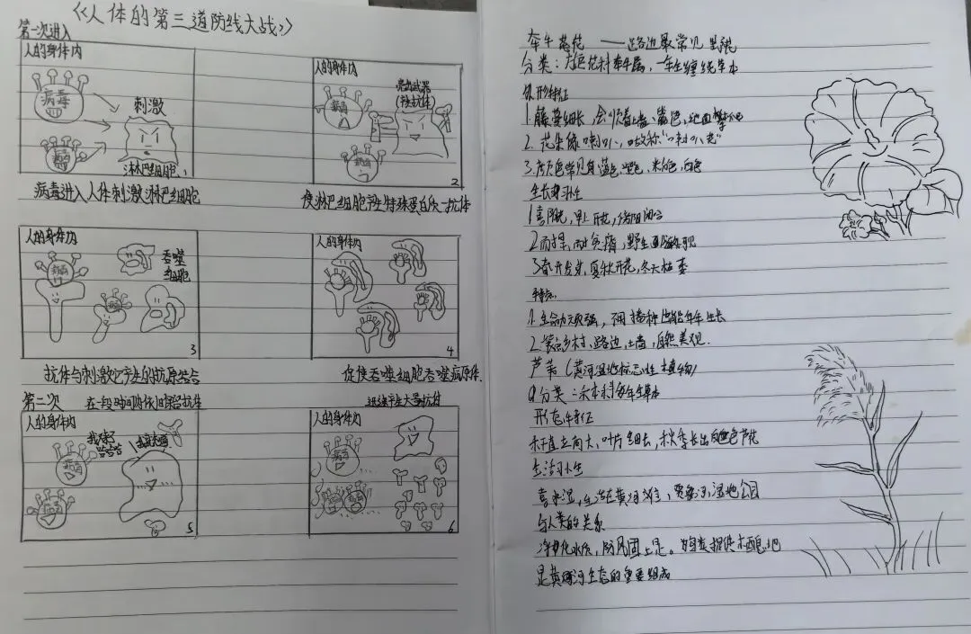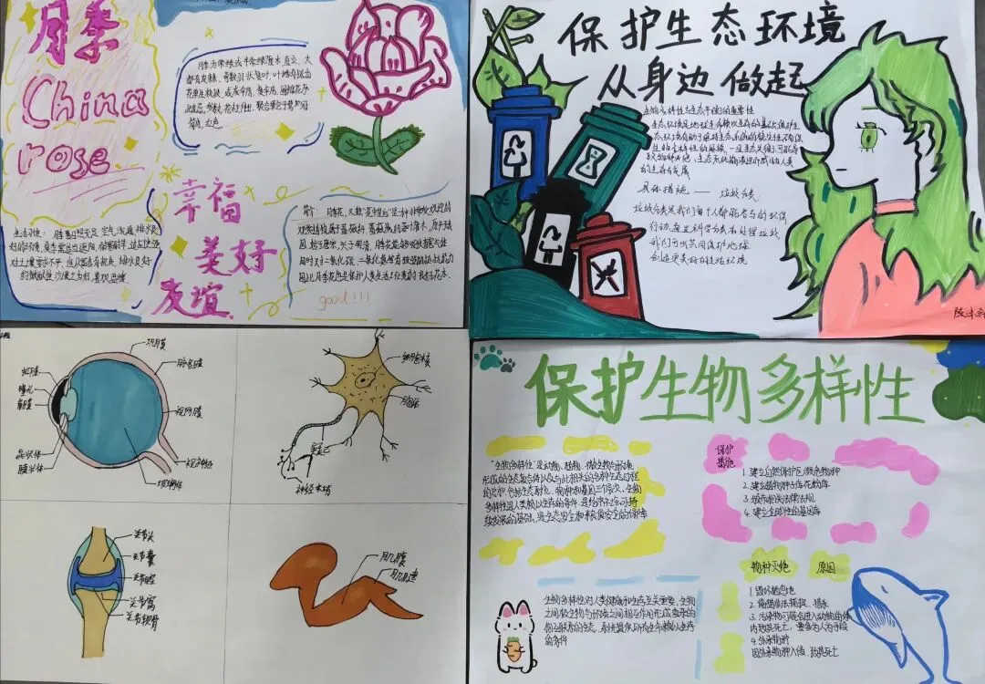 八年级同学勾画关节、眼球的结构示意图,提出对生物多样性与生态保护的倡议,以及人体免疫防线的科普。这些作品不仅展现了学生扎实的学科知识,更传递了对生命的敬畏与对自然的责任。