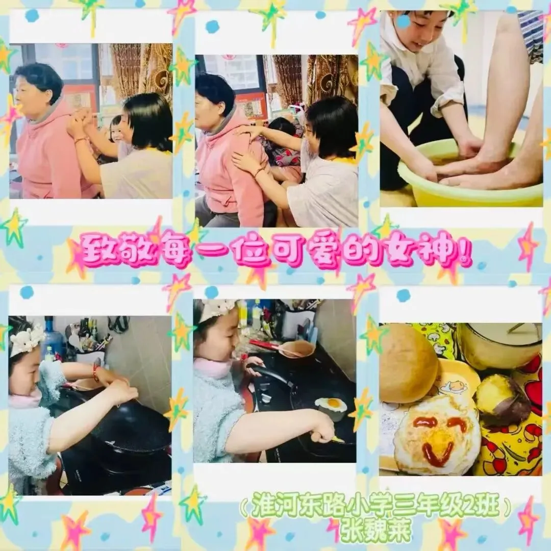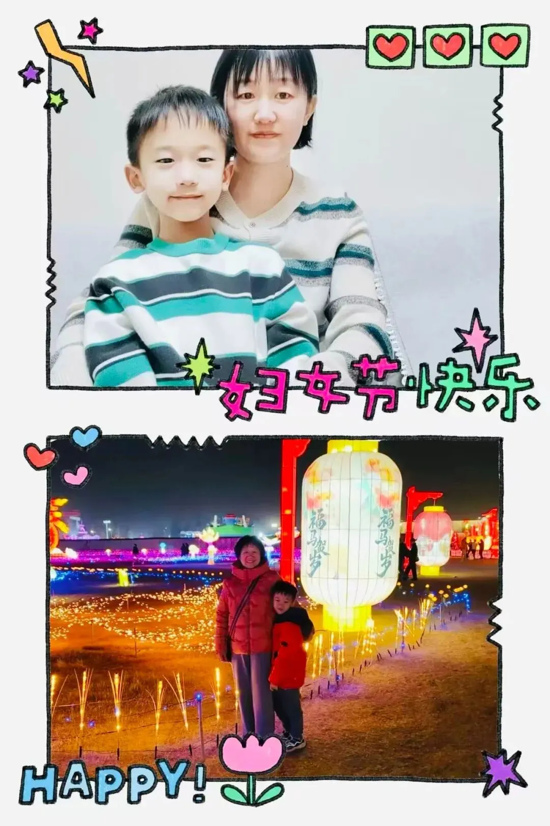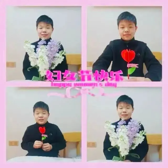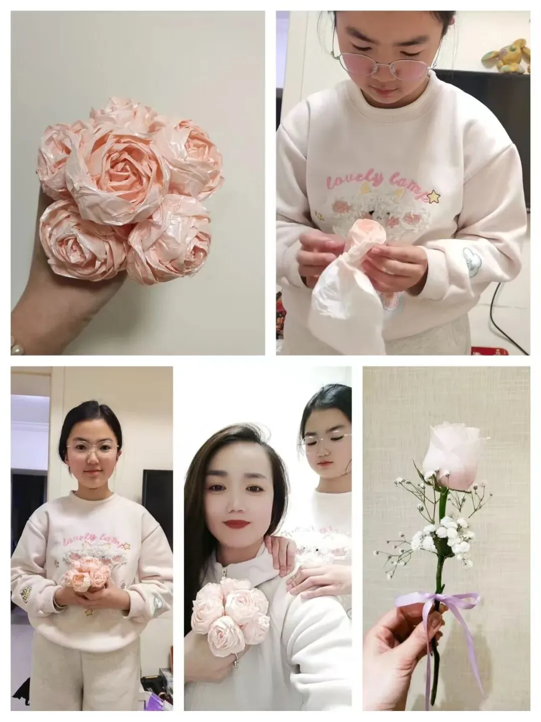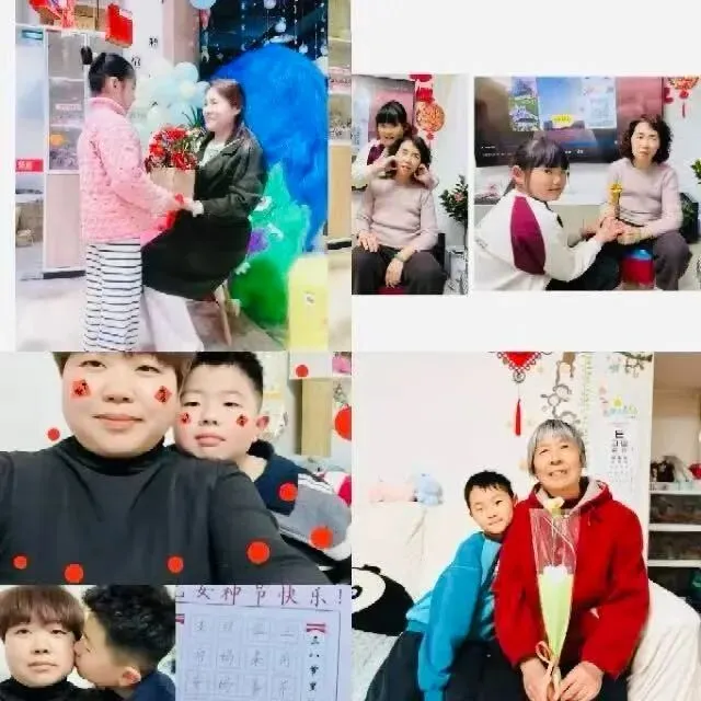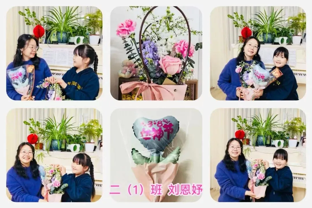 活动结合学段特点分层设计,兼顾趣味性与实践性。一二年级开展“我和女神合个影”活动,孩子们与妈妈、奶奶或姥姥创意合影,依偎拥抱、牵手比心,用镜头定格亲子温情,成为春日里最动人的画面。