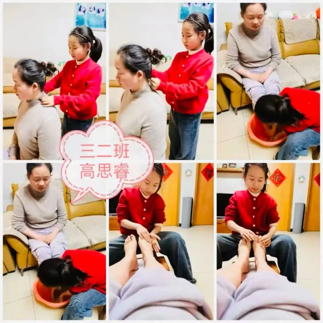 三四年级以“今天换我来爱你”为主题,学生化身暖心小当家,为长辈梳头、按摩、洗脚,还主动承担拖地、整理房间等家务,在劳动中体会长辈辛劳,用行动诠释感恩与担当。