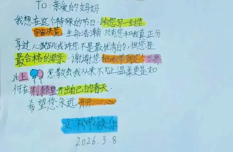 在2026年“3·5”学雷锋纪念日与“3·8”国际妇女节交汇之际,学校开展感恩教育实践活动,引导学生以行动致敬家中女性长辈,让雷锋精神在温情中落地。