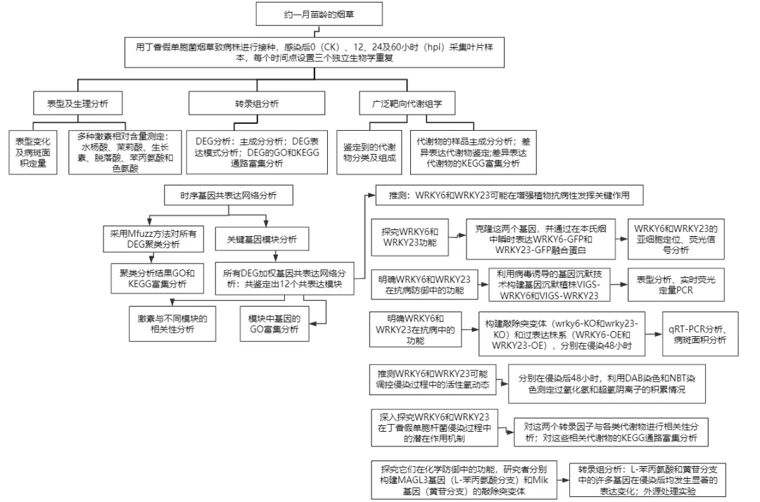 方法:研究者整合时间序列转录组学和代谢组学数据,重构烟草的动态响应模式。通过时序基因共表达网络(TO-GCN)和加权基因共表达网络分析(WGCNA)探索阶段特异性调控模块,并通过构建转基因株系验证WRKY6和WRKY23在抗病性中的作用。