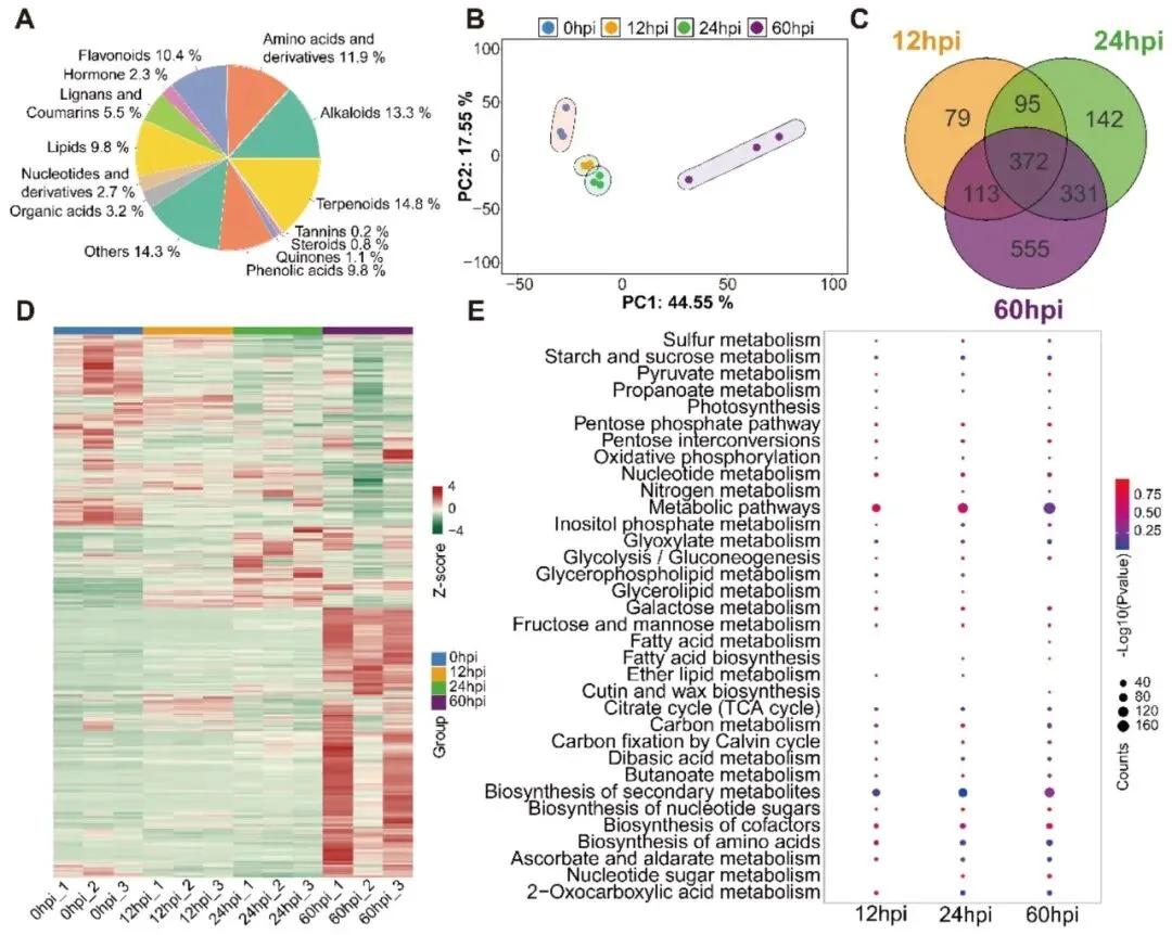 图4. 代谢物分类及差异表达代谢物的鉴定。(A) 鉴定到的代谢物分类及组成。(B) 基于所鉴定代谢物的样品主成分分析。(C) 丁香假单胞杆菌侵染后差异表达代谢物的维恩图。(D) 不同侵染后时间点所有差异表达代谢物的热图。(E) 不同侵染后时间点差异表达代谢物的KEGG富集分析,点大小表示代谢物数量,颜色代表富集显著性。