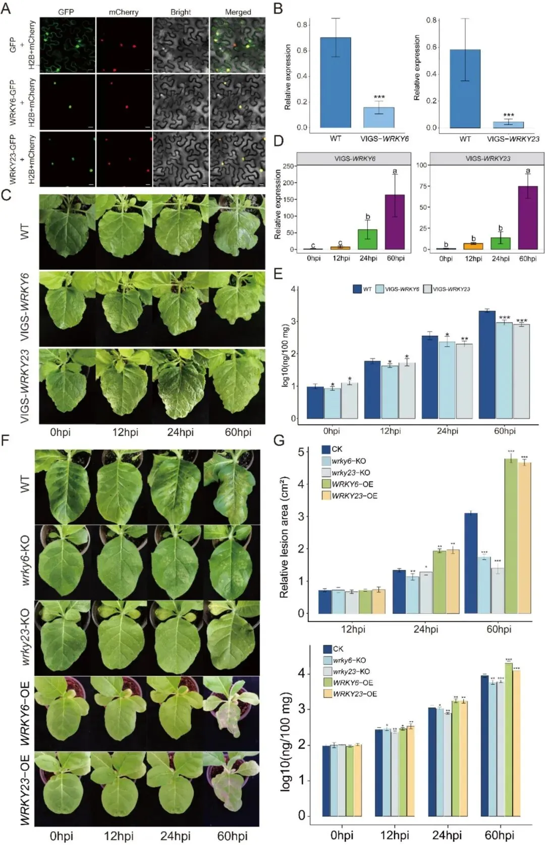 图6. WRKY6和WRKY23通过活性氧信号介导核定位的防御反应以应对丁香假单胞杆菌侵染。(A) WRKY6和WRKY23的亚细胞定位。用融合构建体(WRKY6-GFP 和 WRKY23-GFP)和核标记物H2B-mCherry瞬时转化本氏烟叶片。(B) WRKY6和WRKY23在野生型和VIGS-WRKY6/VIGS-WRKY23沉默植株中的相对表达水平。(C) 野生型与VIGS-WRKY6/VIGS-WRKY23沉默植株在丁香假单胞杆菌侵染后的表型分析。(D) 丁香假单胞杆菌侵染过程中,WRKY6和WRKY23在VIGS-WRKY6/VIGS-WRKY23沉默植株中的时序表达模式。(E) 使用种特异性引物对通过实时荧光定量PCR对侵染叶片中丁香假单胞杆菌DNA进行定量。(F) 野生型、wrky6-KO、wrky23-KO、WRKY6-OE和WRKY23-OE植株在丁香假单胞杆菌接种后0、12、24和60 hpi的表型分析。(G) 野生型、敲除突变体和过表达株系在0、12、24和60 hpi的相对病斑面积和丁香假单胞杆菌DNA水平的定量。数据为三次独立生物学重复的平均值±标准误(N=3)。(B)和(E)图的统计学显著性采用双尾Student t检验进行评估(P<0.05 (*),P<0.01 (**),P<0.001 (***);NS,无显著差异)。对于(D)图中的多组比较,使用单因素方差分析 followed by Tukey–Kramer检验;柱上不同小写字母表示在P<0.05水平差异显著。