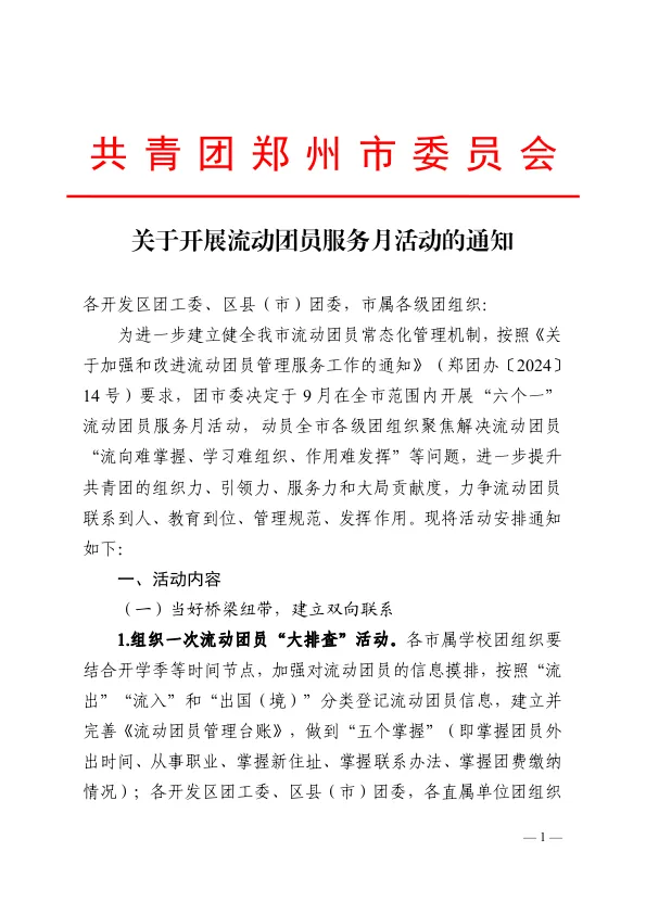 自共青团郑州市委《关于加强和改进流动团员管理服务工作的通知》(郑团办〔2024〕14号)印发以来,全市各级团组织发挥“党建带团建”优势,聚焦流动团员“情况难掌握、管理难规范、学习难组织、服务难保障、作用难发挥”痛点,以“服务月”活动为抓手,以“游郑州”品牌为载体,构建流出地与流入地团组织有机衔接、管理与服务工作深度融合的新格局。