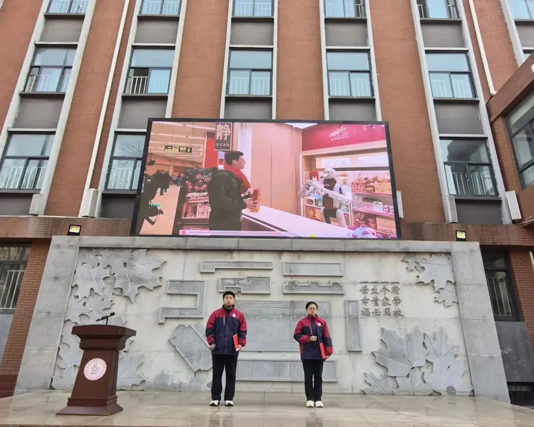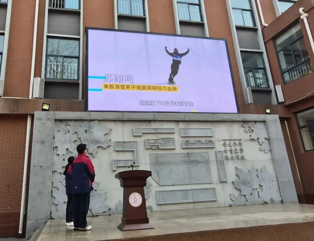 国旗猎猎,初心如磐。伴随着雄壮的国歌,五星红旗冉冉升起,全体师生肃立注目,目光所及皆是赤诚,新学期的奋进号角正式吹响。当春日的微风拂过操场,科技与热血的种子已在少年心中悄然扎根——大屏幕上,春晚AI机器人的灵动身影展现中国科技的硬核实力,幕后研发的坚守故事,让学子读懂“所有惊艳皆源于深耕”;米兰冬奥会的赛场瞬间更是点燃全场,苏翊鸣的全力以赴、徐梦桃的百折不挠、宁忠岩的逆势突破、谷爱凌的极致拼搏,一句句铿锵誓言、一个个感人瞬间,将奥运精神的内核深深镌刻在少年心间,现场掌声迭起,成为最热烈的青春回响。