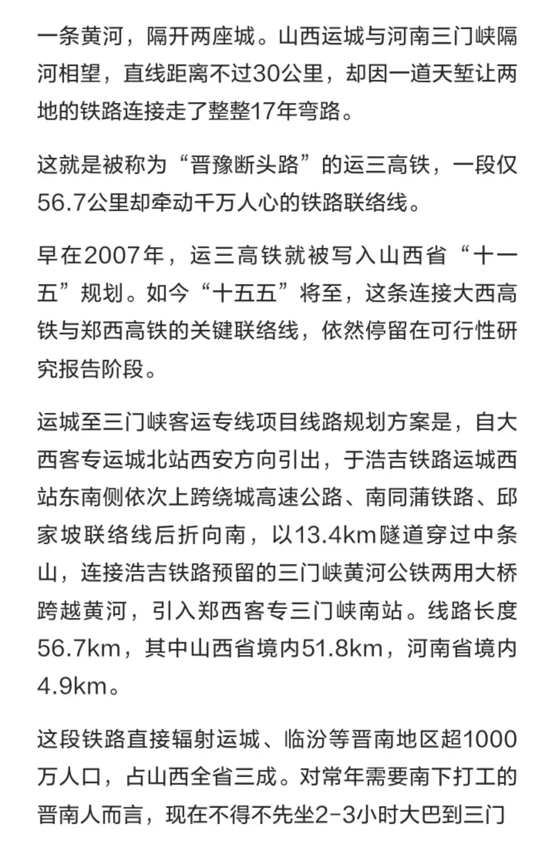 从最初规划到现在,这条高铁已经折腾了将近20年的时间,在国家以及晋豫两省的十四五计划中都被列入其中,就连三门峡黄河公铁大桥的位置都已经预留好了,并且相关的可研报告、接轨方案等文件也都准备完毕了,但是就是迟迟不能开工,连国铁集团的1年工作安排都无法进入前期阶段。