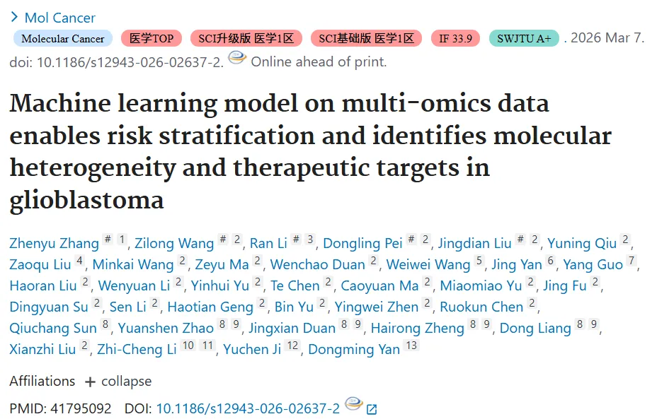 2026年3月7日,发表在《Molecular Cancer》的研究“Machine learning model on multi-omics data enables risk stratification and identifies molecular heterogeneity and therapeutic targets in glioblastoma”首次开发并验证了一个基于五种组学模态晚期融合的机器学习模型,成功实现了对IDH野生型GBM患者的精准风险分层。