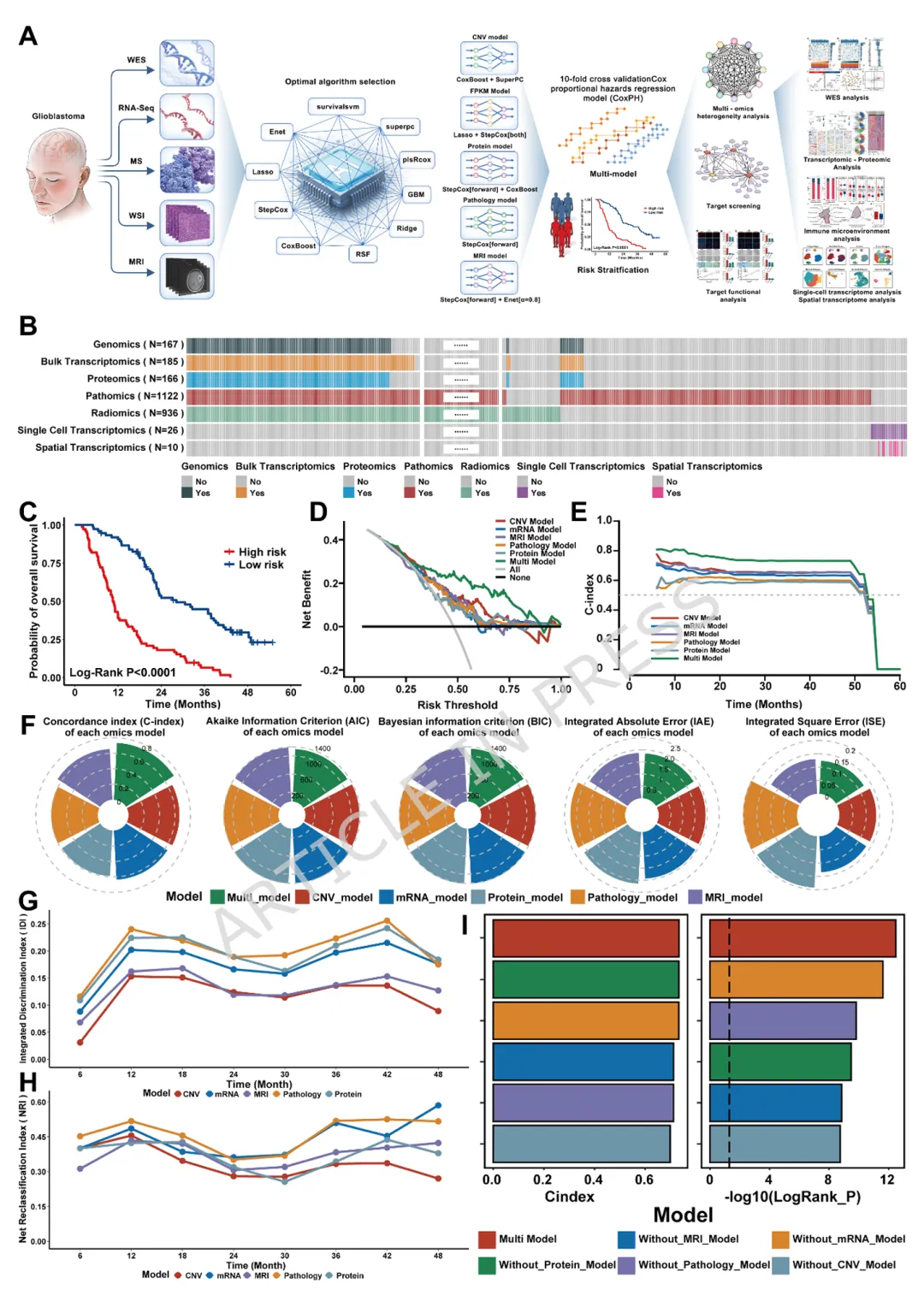 研究构建了一个整合转录组、蛋白质组、基因组、磁共振影像与病理切片共五种数据的胶质母细胞瘤多模态预后模型。验证表明,该融合模型在多项核心指标上均显著优于任何单一模态模型(图1)。