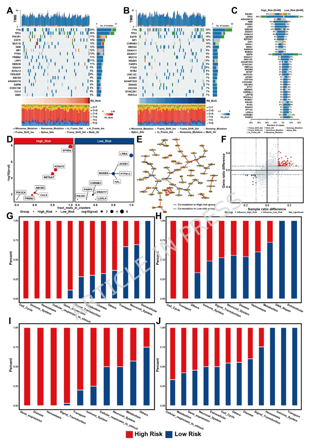 胶质母细胞瘤高低风险亚群存在显著突变差异:高风险组富集TP53突变及细胞周期与免疫相关通路;低风险组突变则富集于神经元功能与代谢通路(图2)。