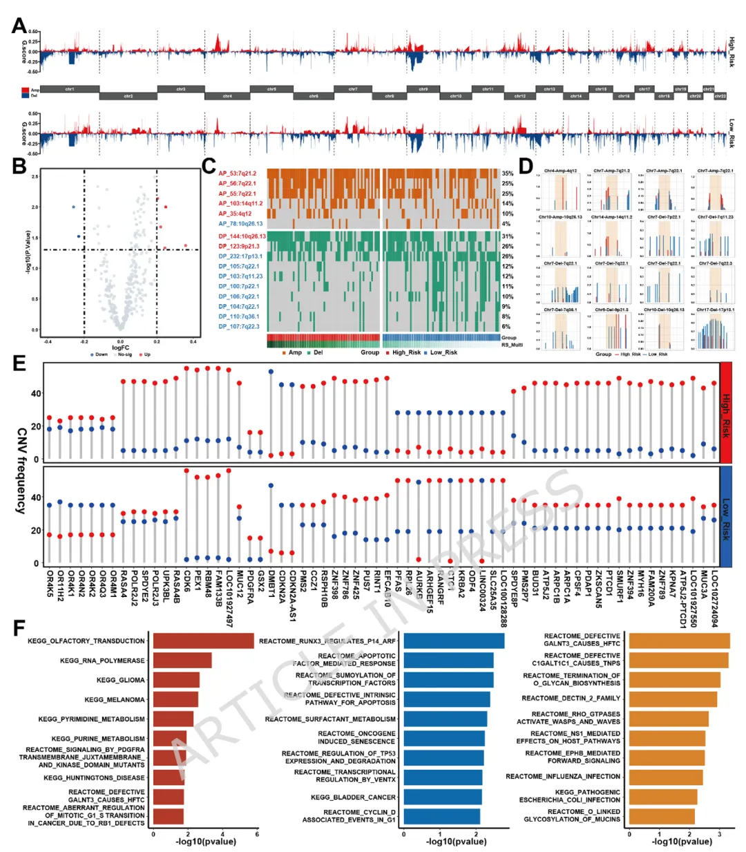 研究揭示了胶质母细胞瘤高低风险亚群存在不同的拷贝数变异图谱,并识别出16个差异显著的染色体区带。其中,高风险组拷贝数变异与肿瘤信号通路和细胞周期密切相关,而低风险组则主要与糖基化等功能改变相关(图3)。