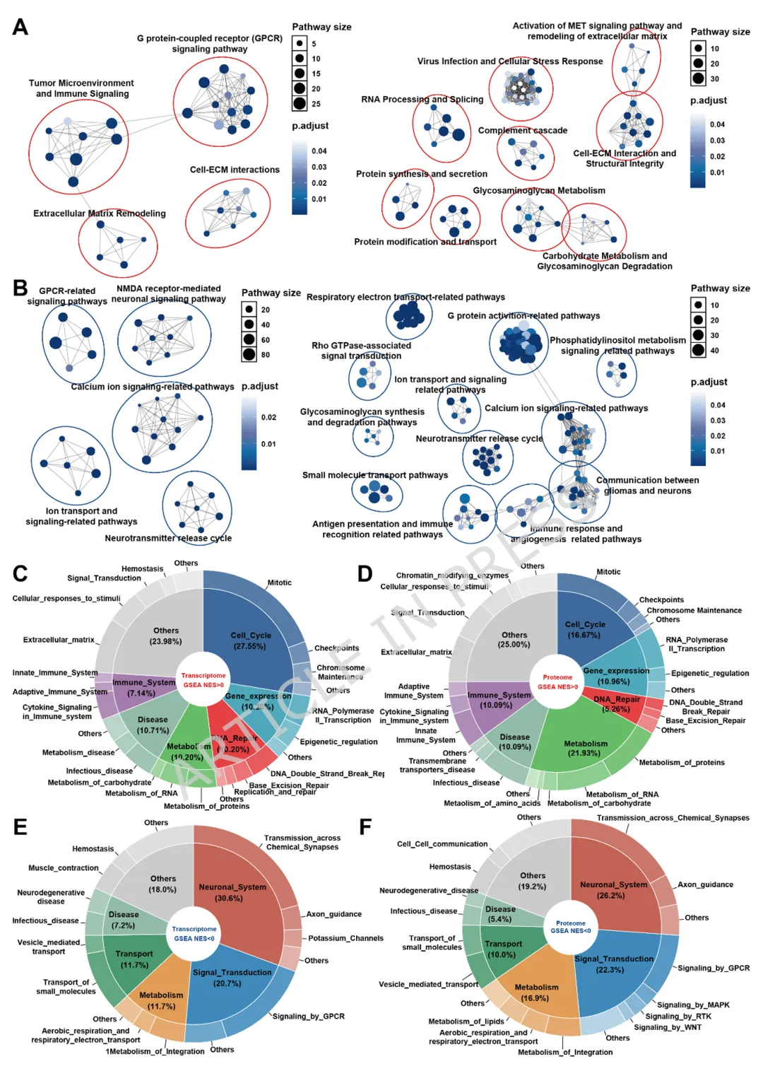 胶质母细胞瘤高低风险亚群在转录与蛋白层面存在截然不同的核心生物学过程。高风险组以细胞周期、免疫应答和代谢活跃为特征,而低风险组则富集于神经元功能和突触信号传导通路(图4)。