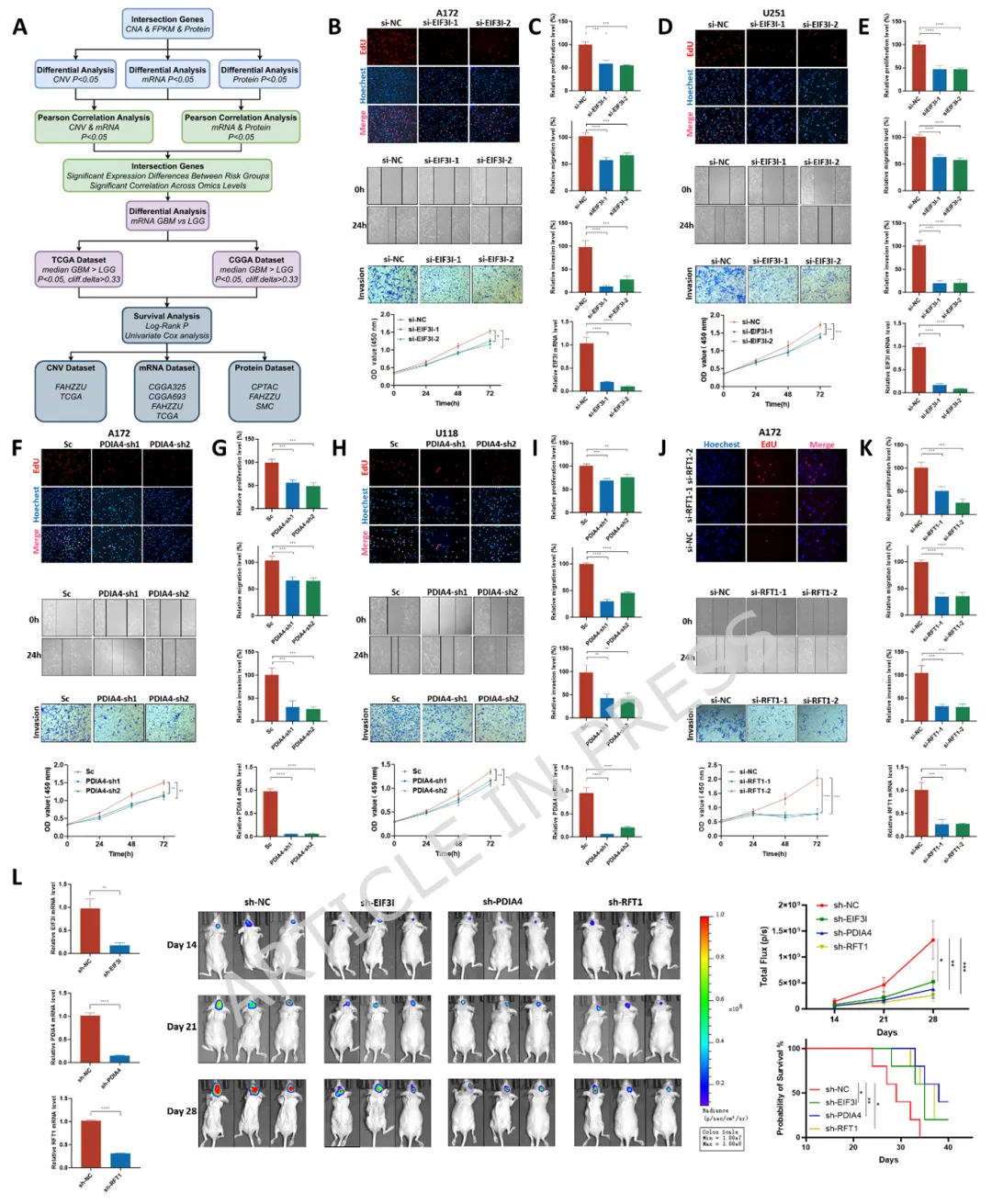 研究基于多组学数据筛选出胶质母细胞瘤高风险相关的关键基因PDIA4、RFT1与EIF3I。体内外功能实验证实,敲低任一基因均能显著抑制肿瘤细胞的增殖、迁移、侵袭及体内成瘤能力(图6)。