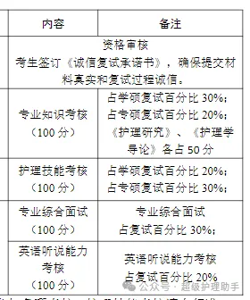 复试的主要内容及权重复试内容主要包括:外语口语听力和专业能力考核。复试分值采用百分制,其中,外语口语听力占20%,专业能力考核占80%。专业能力考核涵盖专业知识考核、护理技能考核、专业综合面试等相关内容。具体如下: