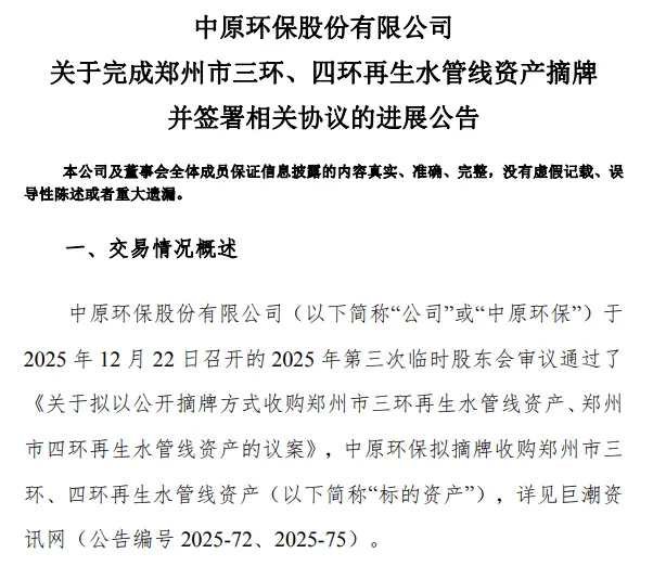 日前,中原环保(000544.SZ)发布公告确认,郑州市新泓再生水资源开发利用有限公司(下称“新泓公司”)和郑州市格沃环保开发有限公司(下称“格沃公司”)已完成工商变更登记,正式成为其全资子公司。山河资本圈注意到,此次新泓、格沃被中原环保收入囊中,并不是突然“空降”,而是一场时隔多年的“曲线回归”。公开资料显示,中原环保前身为1993年在深交所上市的白鸽(集团)股份有限公司。2003年,郑州市热力总公司通过资产重组注入集中供热业务;2006年郑州市污水净化有限公司(下称“净化公司”)成为第二大股东,并注入王新庄污水处理厂资产;2007年1月,公司完成更名转型,主营业务定型为环保公用事业,下设水务、供热等分支机构。2022年,中原环保收购净化公司100%股权,但在交易过程中,经郑州市国资委批准,净化公司将持有的新泓公司、格沃公司100%股权“剥离”出来,无偿划转至郑州公用事业投资发展集团有限公司(下称“公用集团”)。至2025年11月,郑州市人民政府批复,将公用集团持有的上述两家公司股权无偿划转至郑州市国资委。一个月后,郑州市国资委便将两家公司股权公开挂牌转让,新泓公司挂牌价1.46亿元,格沃公司挂牌价1.33亿元。随后,中原环保历时两个月,重新将新泓公司和格沃公司收入麾下。山河资本圈注意到,两家标的公司呈现出截然不同的经营状态。资料显示,新泓公司的核心业务是再生水销售、管网运维,手握“长期饭票”,其与豫能热电签了25年的供水合同。据中原环保测算,收购后预计年均增收2667万元,净利润增904万元。而格沃公司则有点特殊,其主营污泥处理处置的技术研发与方案设计,手握33项专利、18项软件著作权,掌握热解气化、热干化等核心工艺。从技术储备看,它本应是污泥处置领域的“一把好手”。据公告披露,格沃公司2024年还实现营业收入6155.31万元、净利润744.01万元;但到2025年1-9月,其营业收入骤降至1.13万元,净利润为-58.96万元。对于业绩断崖式下滑的原因,中原环保在公告中解释称:自2022年划转至公用集团后,为避免与上市公司产生同业竞争,格沃公司未再开拓新市场及新项目。而后续如何盘活该资产将成为中原环保的下一步考验。尤为值得一提的是,中原环保自身的资金压力也不容忽视。2025年三季报显示,公司前三季度营业收入39.00亿元,同比下降4.60%;应收账款高达89.65亿元,应收账款周转率连续五年下降,回款压力持续加大。在此背景下,约2.79亿元的现金收购,无疑会加剧公司的资金压力。但如果只盯着中原环保的短期经营压力,可能就会错过其背后郑州国资环保资产整合的一盘大棋。穿透股权显示,郑州市国资委100%持股郑州公用集团,而公用集团正是中原环保的控股股东,也是本次整合的实际操盘方。作为郑州市属公用事业核心国资平台,公用集团的环保版图远不止于中原环保。公开信息显示,公用集团旗下还拥有郑州公用环境科技有限公司(下称“公用环境”)、垃圾焚烧发电等环保资产。其中,公用环境主要负责餐厨垃圾处理项目的投资建设与运营。山河资本圈梳理发现,新泓公司和格沃公司的注入,或许只是公用集团环保资产证券化的“前菜”。而其真正的意图,或是通过资产腾挪将中原环保从“水务公司”转型为“水—再生水—污泥—固废”综合平台。实际上,这一布局早有铺垫。2025年,中原环保拿下郑州市三环、四环再生水管线资产,并设立再生水事业部和再生水运营中心。新泓公司的加入,进一步完善了再生水从销售、计量到管网运维的闭环。而格沃公司的技术专利,则为中原环保补上了污泥处置的短板。可以预见,随着整合的推进,公用集团体外剩余的餐厨垃圾处理、垃圾焚烧发电等环保资产,未来不排除陆续注入上市公司的可能性。值得关注的是,资产虽还未注入,但业务已经先行。今年2月,中原环保公告称,全资子公司净化公司拟与公用环境签订餐厨废水处理服务合同,预估收入约515万元。接下来,郑州公用集团体外环保资产是否会加速注入上市公司?山河资本圈将持续关注。