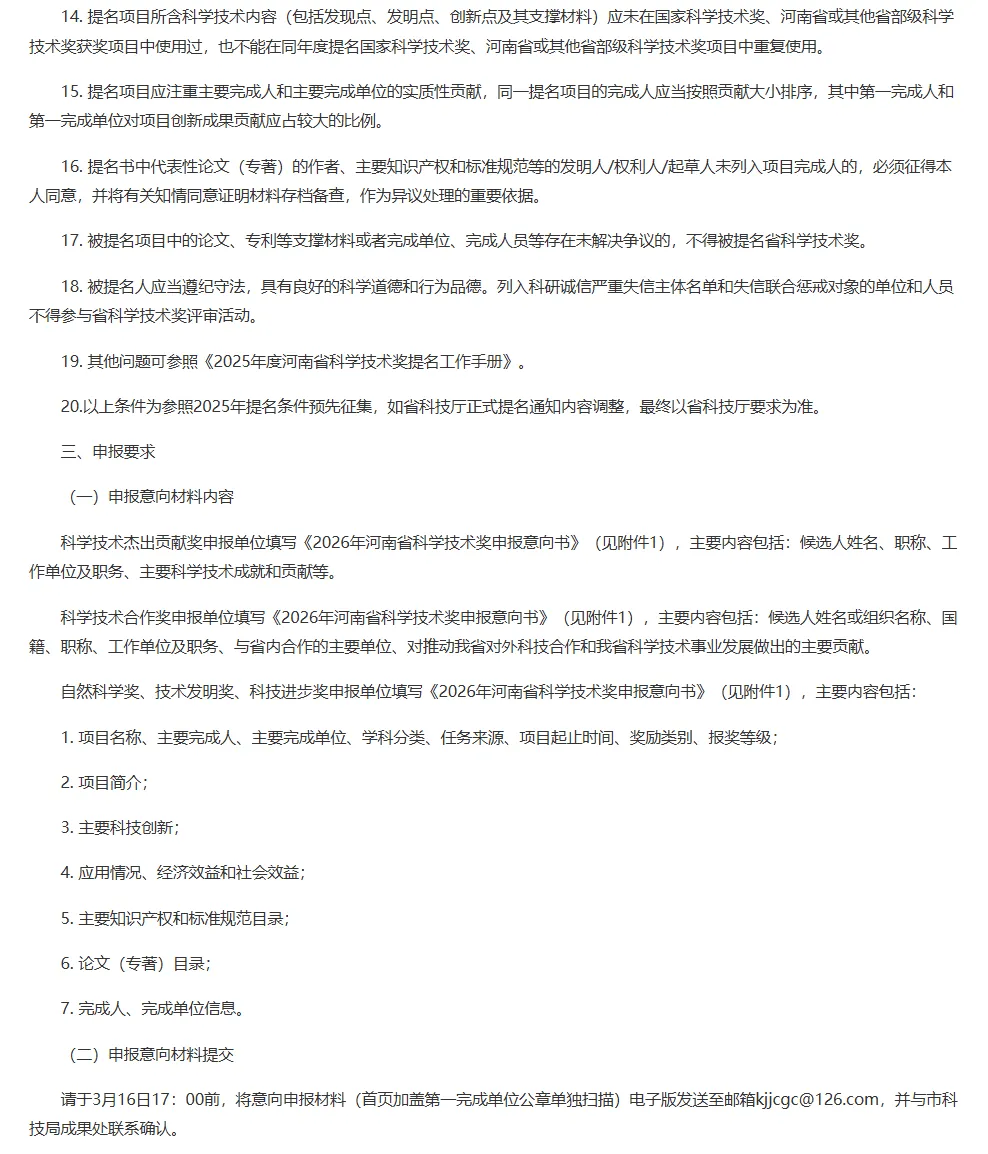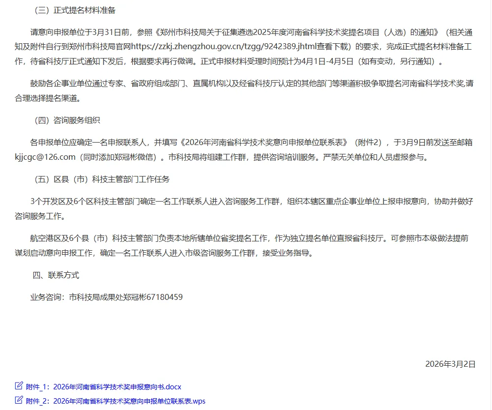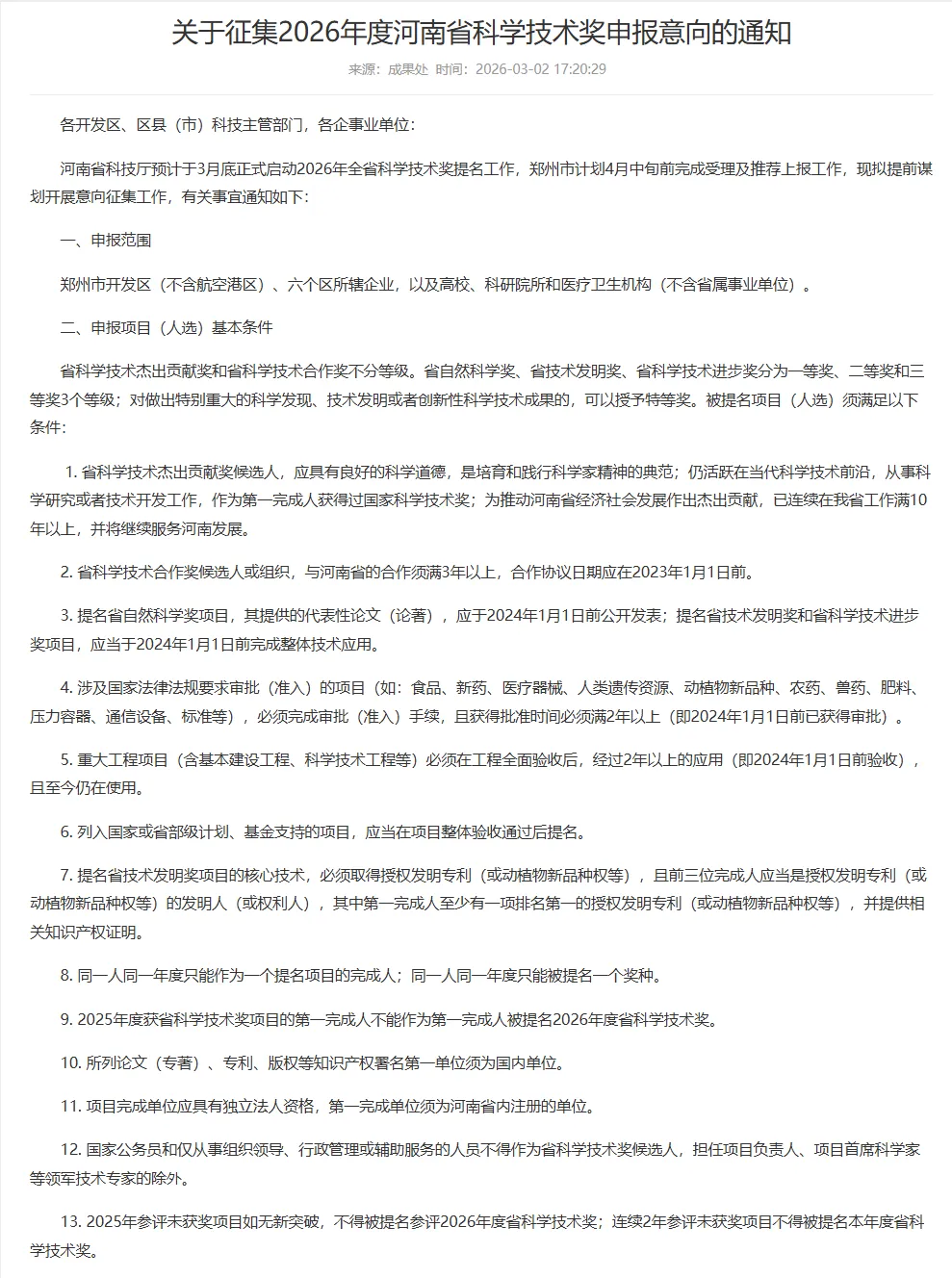 2026 年度河南省科学技术奖申报工作提上日程!郑州市科技局正式启动申报意向征集,省科技厅 3 月底将开启全省提名工作,郑州计划 4 月中旬完成受理推荐,符合条件的企事业单位可抓紧筹备申报啦!