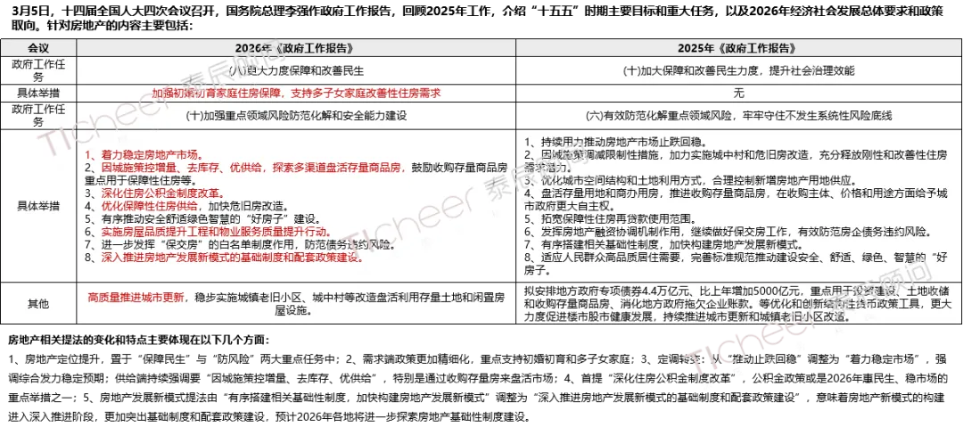 本次政府工作报告进一步强调住房在保障和改善民生中的作用,强调房地产风险化解的重要性,并从供需两端部署工作;延续控增量、去库存、优供给模式,推动行业高质量发展转型;预计2026年各地房地产政策将更加细化,着力点更加精准