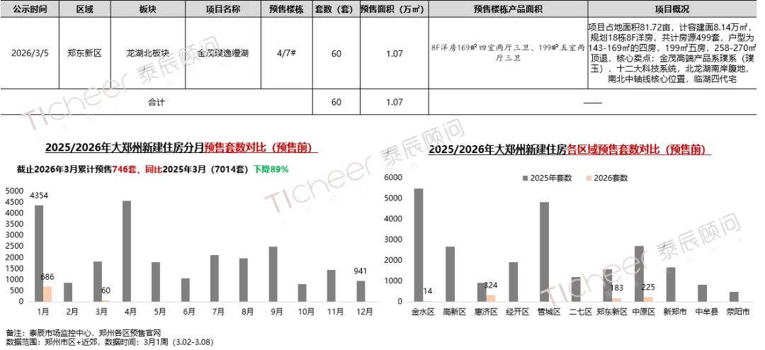 本周1个项目预售前公示,为郑东新区金茂璞逸缦湖项目,共计60套8F洋房,涵盖户型169㎡四室两厅三卫、199㎡五室两厅三卫