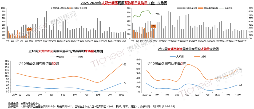 3月1周大郑州新房整体认购306套,环比+32%,成交持续回升至节前水平;其中热销盘认购221套,环比+31%,占比72%;单盘来访均值72组,环比+44%,单盘成交均值2.5套,环比+39%,客户到访积极性提升