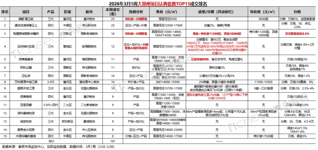 大郑州TOP15榜单合计认购181套,环比上周140套+29%,榜单门槛8套(环比+3套),伴随市场热度回升,绿都、电建、远洋分销+特价齐发力,认购环比回升明显