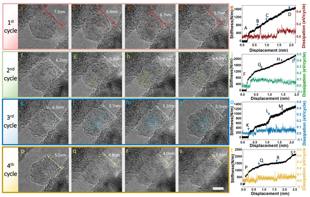 图 2.金刚石纳米粒子的塑性变形过程。该纳米粒子经过四次压缩以研究其变形机制。a-e、f-j、k-o 和 p-t 分别展示了第一次、第二次、第三次和第四次压缩周期的透射电子显微镜图像以及相应的力-位移响应图。g-i 中的虚线突出显示了压缩过程中的无定形区域。l-n 中的虚线标记了由无定形碳网络将纳米粒子分割成小颗粒的位置。A-D、F-I、K-M 和 P-S 在 e、j、o 和 t 中的标注对应于 a-e、f-j、k-o 和 p-t 的透射电子显微镜图像采集时刻。分别地;各自地刻度标尺的长度为 3 纳米。