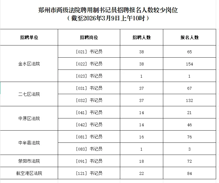 2026年郑州市两级法院聘用制书记员公开招聘报名有关情况(截止3月9日10:00)