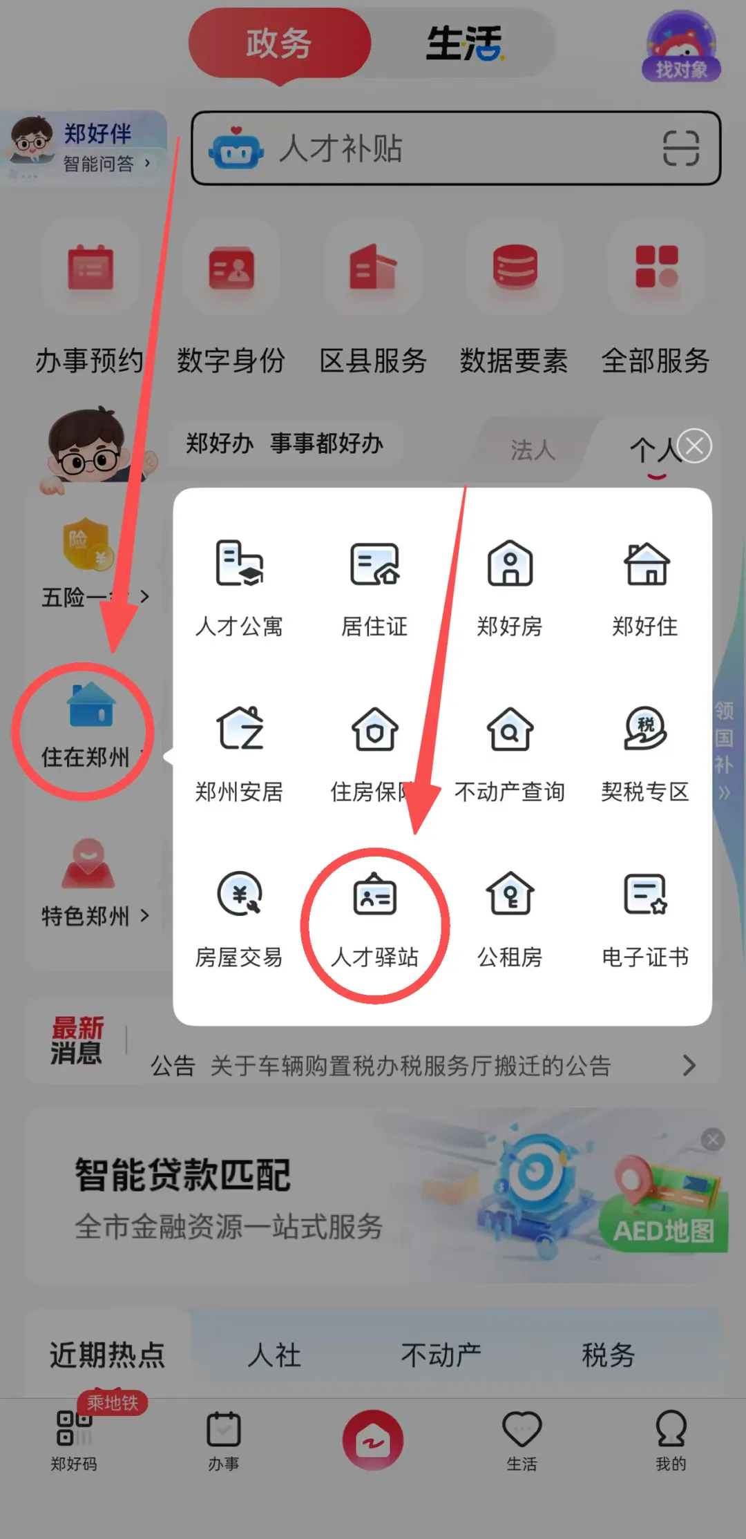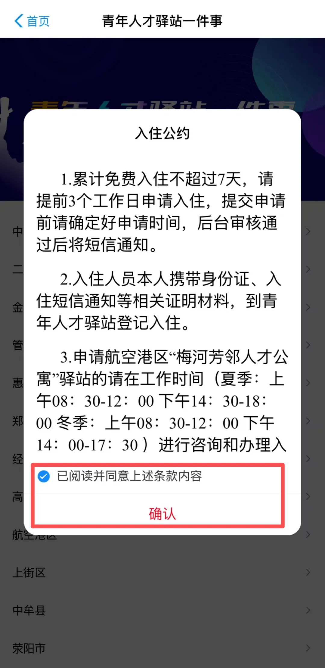 1️⃣打开【郑好办】,点击左侧【住在郑州】,选择【人才驿站】,同意条款后进入