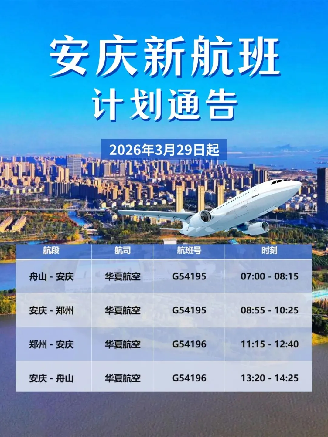 3月29日起,安庆机场将开通由华夏航空执飞的“舟山=安庆=郑州”航线。该航线班期为每周一、三、五、七共4班,机型C909。