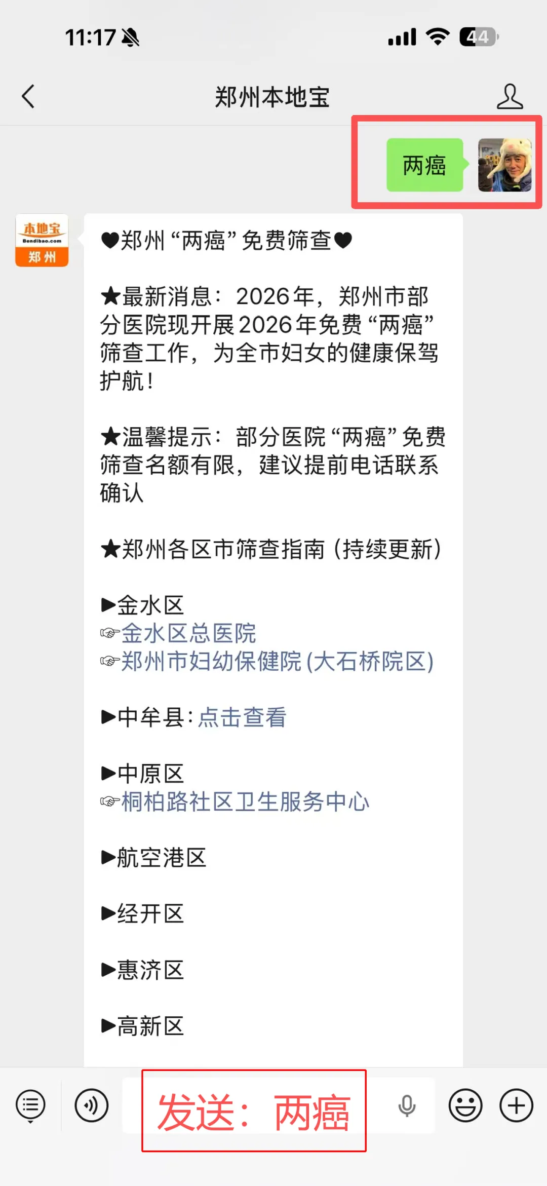 点击左下角头像进入公众号,再点私信,在聊天对话框回复【两癌】即可立即获取2026郑州已公布医院的免费两癌筛查指南、预约电话、预约流程