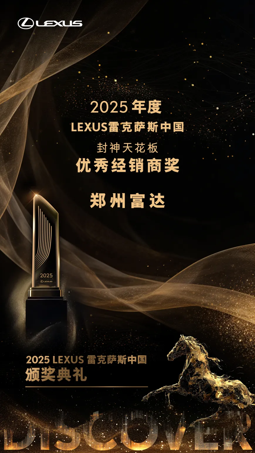 2026年3月9日,雷克萨斯中国经销商大会如期召开。大会揭晓了“2025LEXUS雷克萨斯中国经销商”获奖名单。郑州富达雷克萨斯再度荣获“2025年封神天花板·优秀经销商”殊荣。