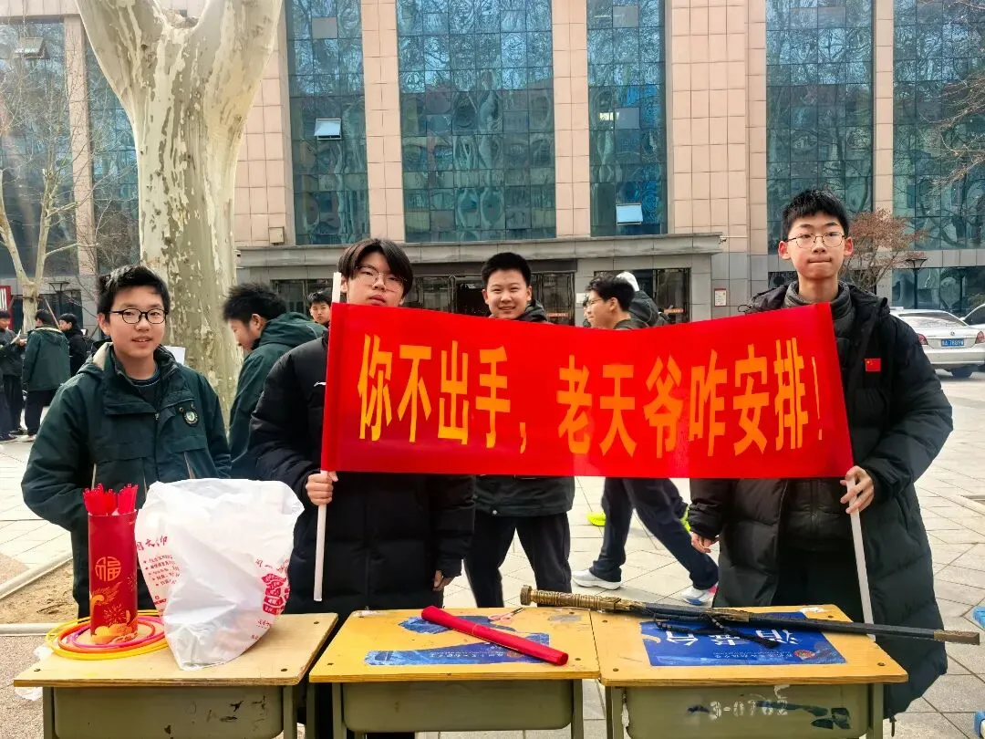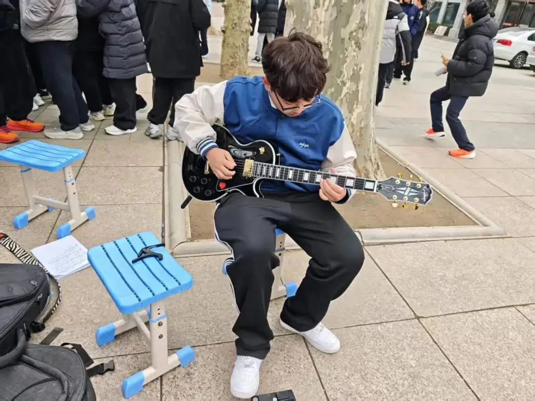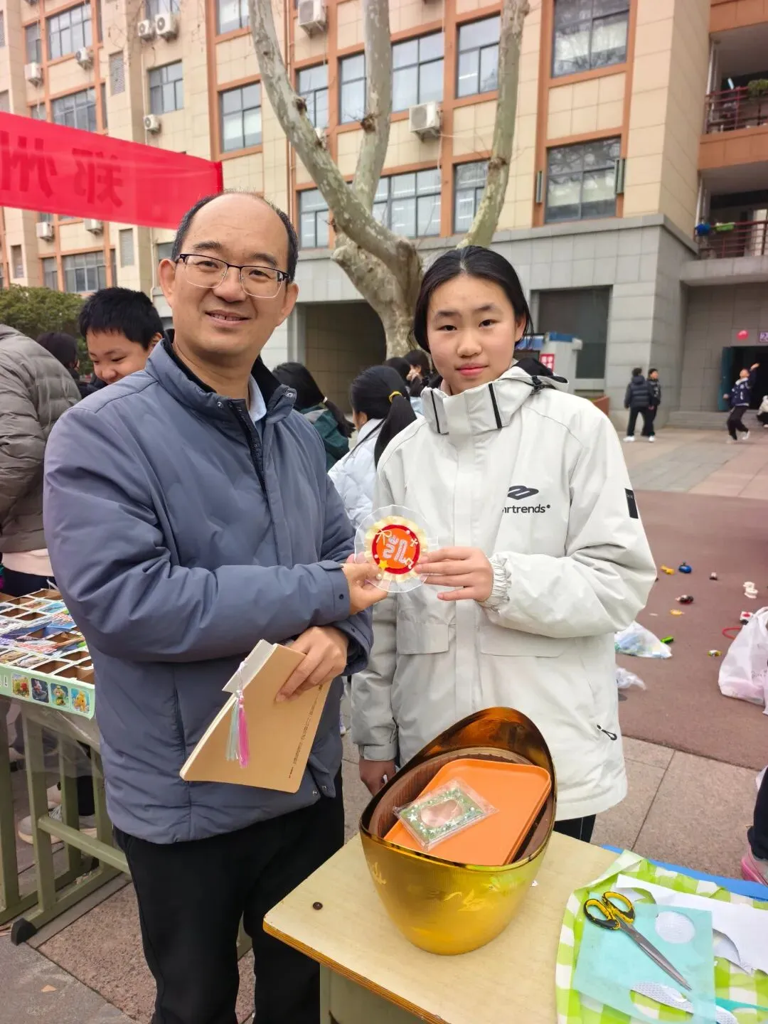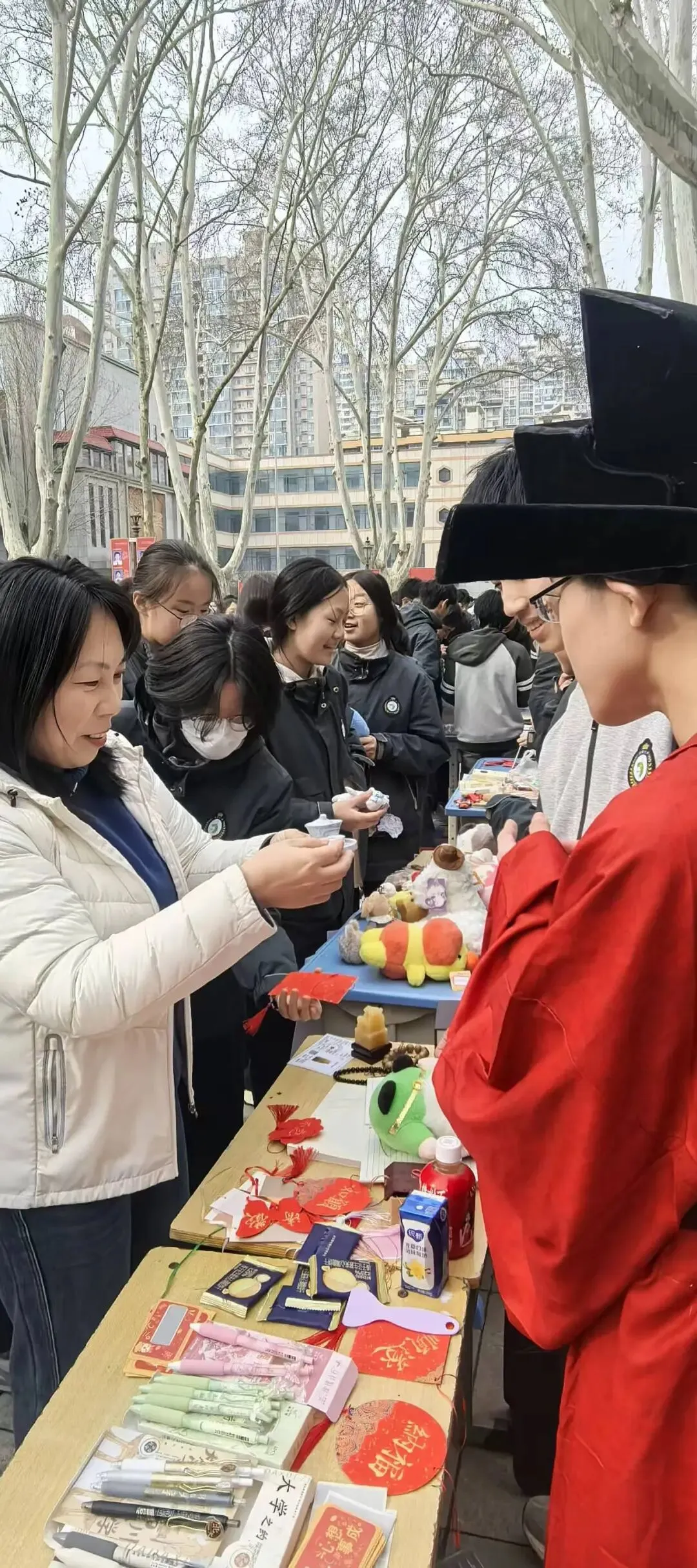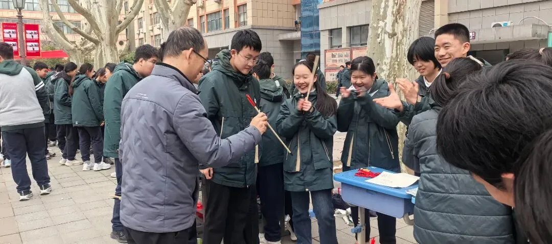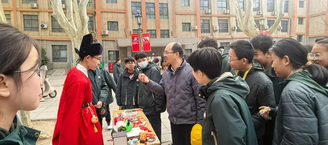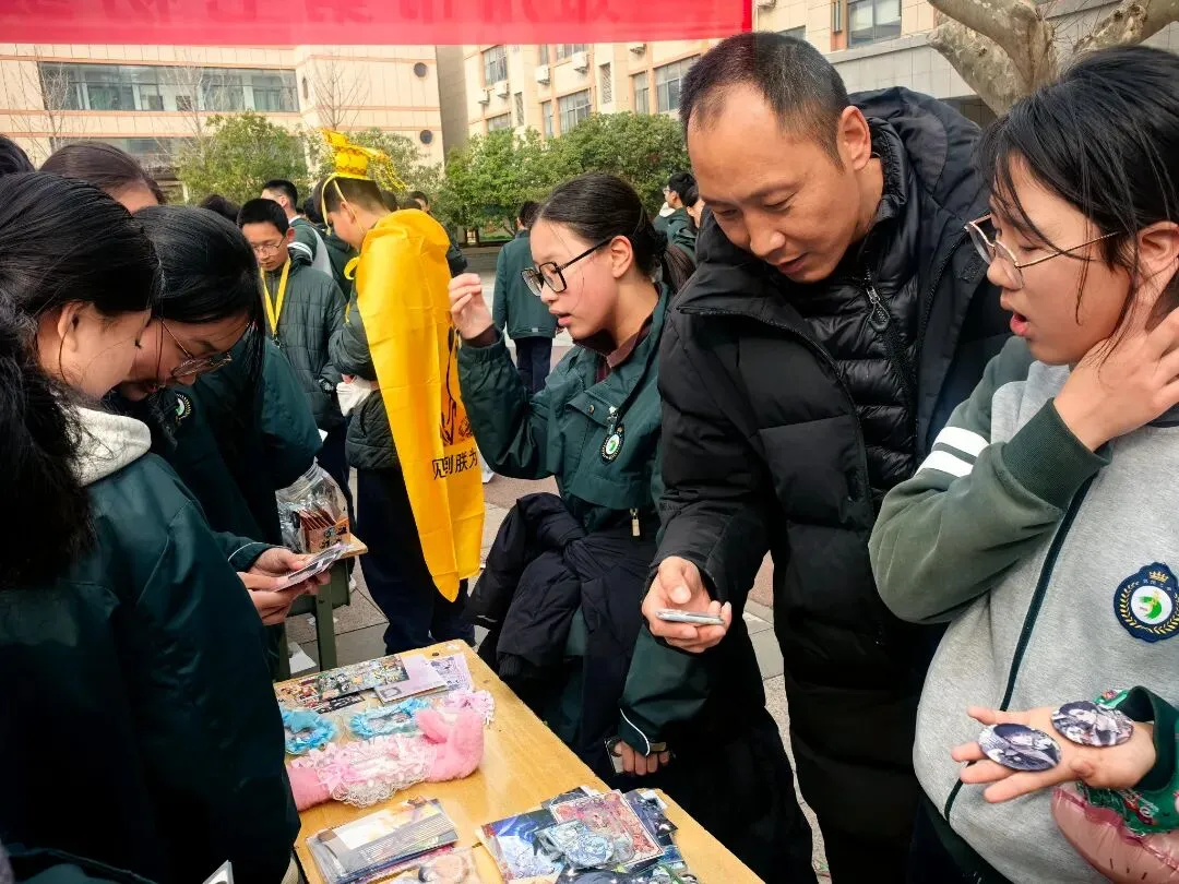 闫凯校长带着满脸笑容逛遍每个摊位,一会儿蹲在手工文创区和同学们讨论编织技巧,一会儿在投壶游戏区给大家当“啦啦队长”,连夸“这手艺比我当年强多啦”!老师们也彻底“放飞自我”——张培娟老师玩起了套圈,乔亮老师在投壶摊位前“偷偷”给学生支招,结果自己忍不住也投了一把;班主任们更是全程“护航”,有的帮学生整理摊位,有的当起“临时收银员”,体育老师张鹏也加入了互动,校园里到处是师生笑作一团的身影。校长和老师们的“沉浸式”参与,让整个庙会像一场热闹的家庭聚会,温暖又治愈。