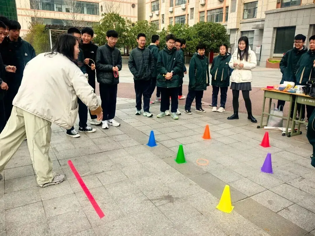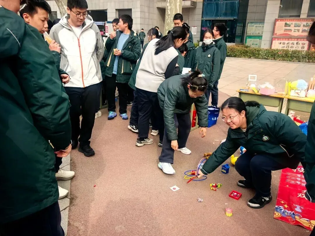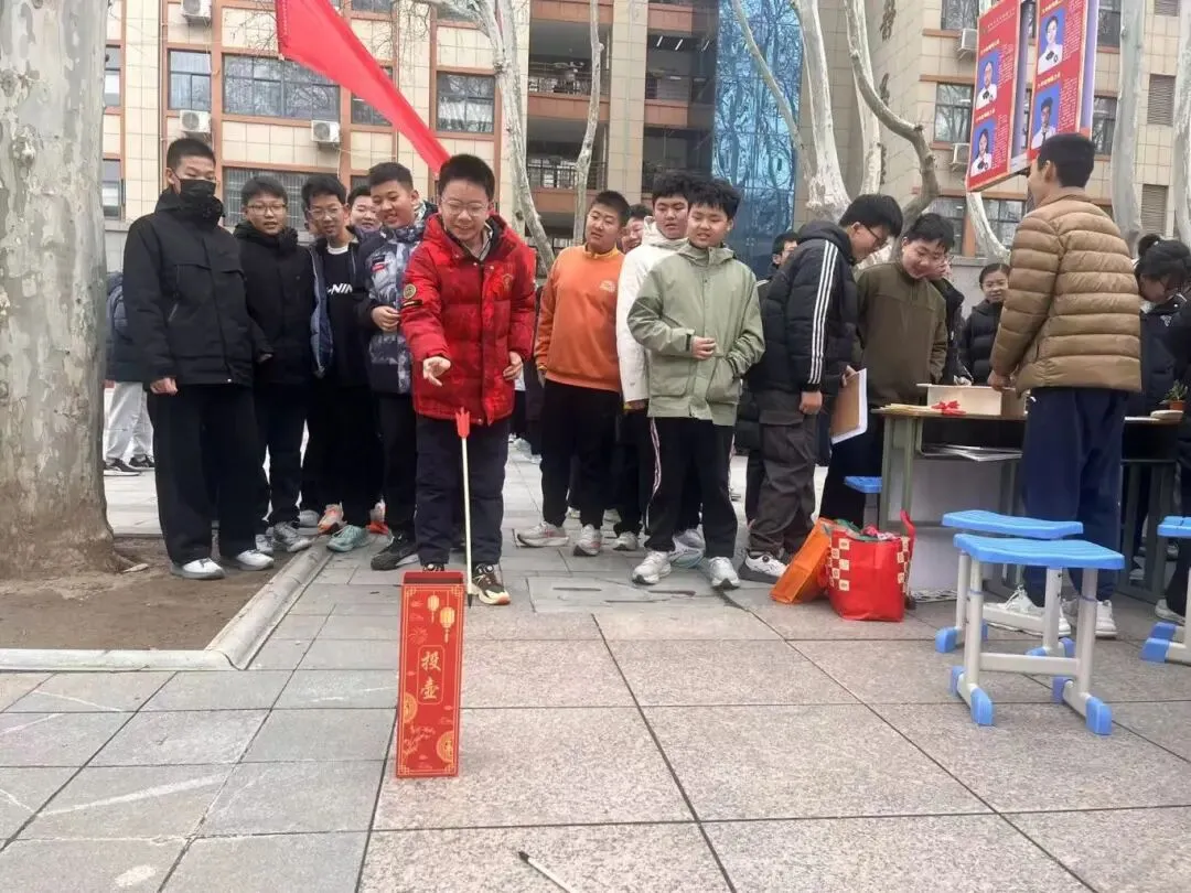 趣味互动区欢声笑语不断,洋溢着节日的喜庆氛围。传统投壶游戏前排起长队,同学们手持箭矢,瞄准壶口,屏息凝神,体验古人雅趣,每当有箭矢投入壶中,便会引来一阵欢呼与掌声;套圈游戏区,彩色锥桶与圆环相映成趣,参与者们跃跃欲试,纷纷展现自己的身手,现场气氛热烈而欢快。