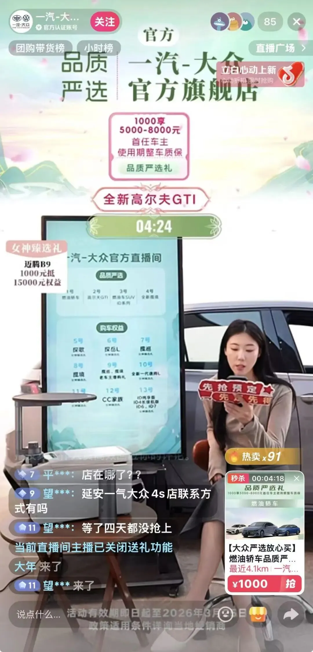 在郑州合众汇金一汽-大众4S店,数盏专业灯光下,主播正对着手机镜头热情介绍车型配置和优惠政策,屏幕上观众的提问和点赞不断刷新。“我们店有2名专职主播,每天分3个时段轮播,直播报价和展厅完全一致,没有所谓的‘专属低价’。”门店负责人赵学忠告诉记者,直播的核心目的是吸引线上客源,尤其是洛阳、南阳甚至省外的客户,通过直播间了解政策后到店成交,目前直播销量已占门店总销量的40%以上。