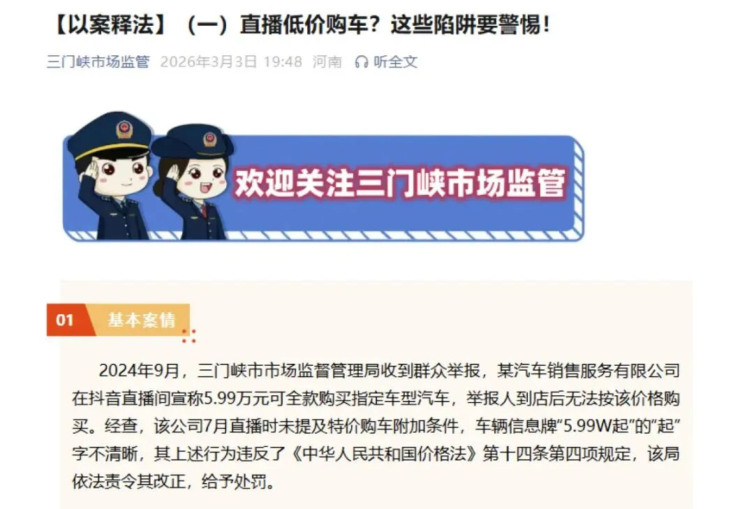 这是直播卖车最常见的套路,主播在直播间喊出“全网最低价”,吸引消费者到店后,却以各种理由加价,让消费者“乘兴而来,败兴而归”。三门峡市市场监督管理局就收到群众举报,某汽车销售服务有限公司在抖音直播间宣称5.99万元可全款购买指定车型汽车,举报人到店后却无法按该价格购买。经查,该公司直播时未提及特价购车附加条件,车辆信息牌“5.99W起”的“起”字不清晰,属于典型的误导消费者的不正当价格行为,最终被执法部门依法责令改正并处罚。