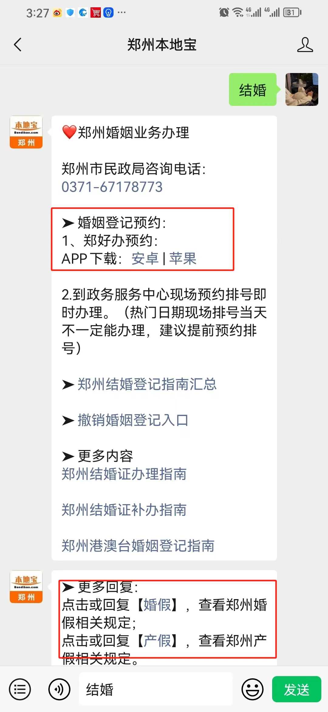 小编提醒:进入郑州本地宝,在对话框回复【婚检】即可获得郑州免费婚检定点医院、婚检材料、注意事项