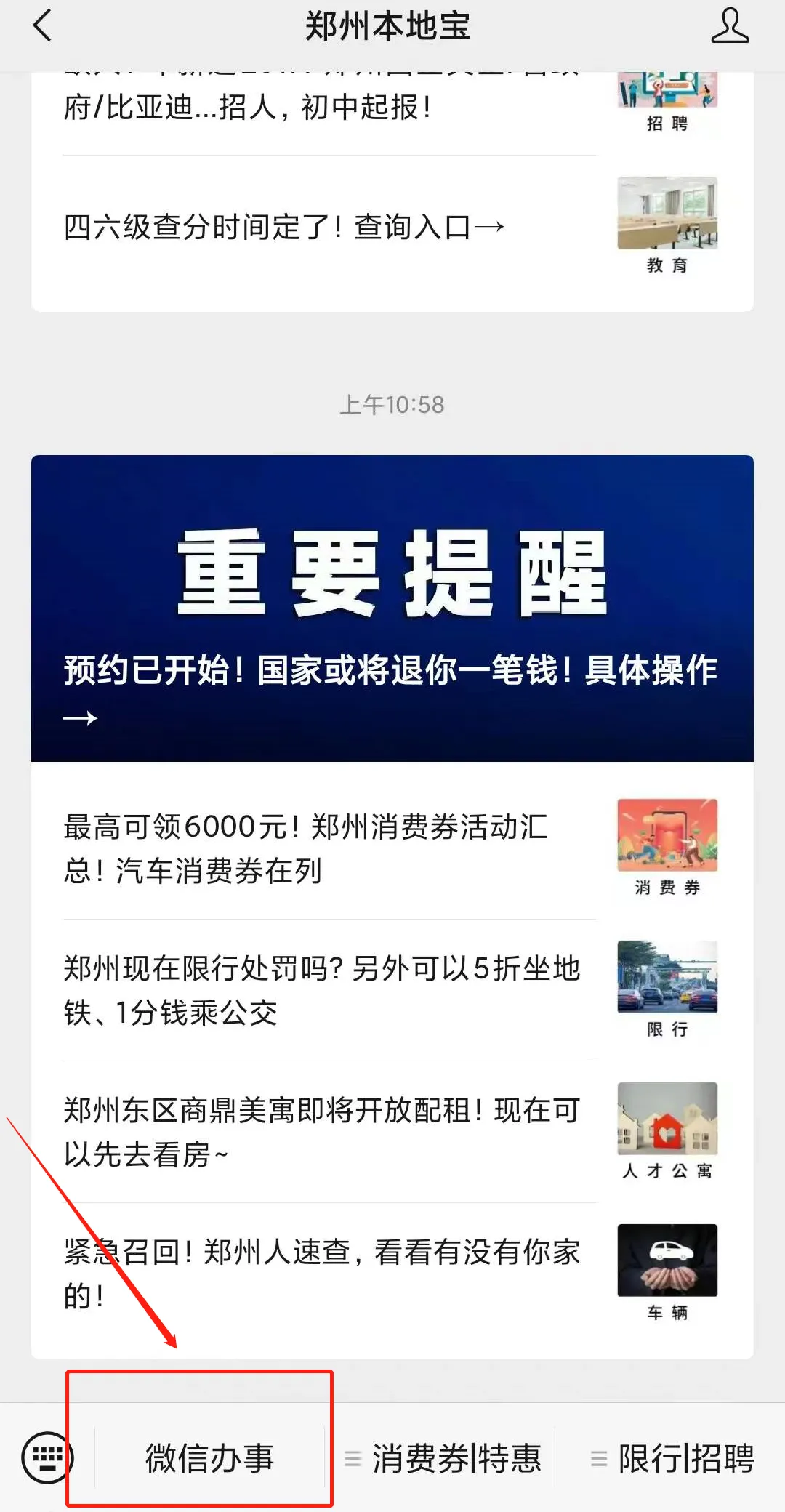➤可以在下方菜单栏点击微信办事,消费券|免费,限行|招聘获取你想看的内容: