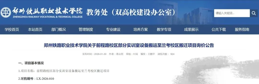同样是年初,郑州铁路职业技术学院,还发了个公告:关于前程路校区部分实训室设备搬运至兰考校区搬迁项目询价公告。