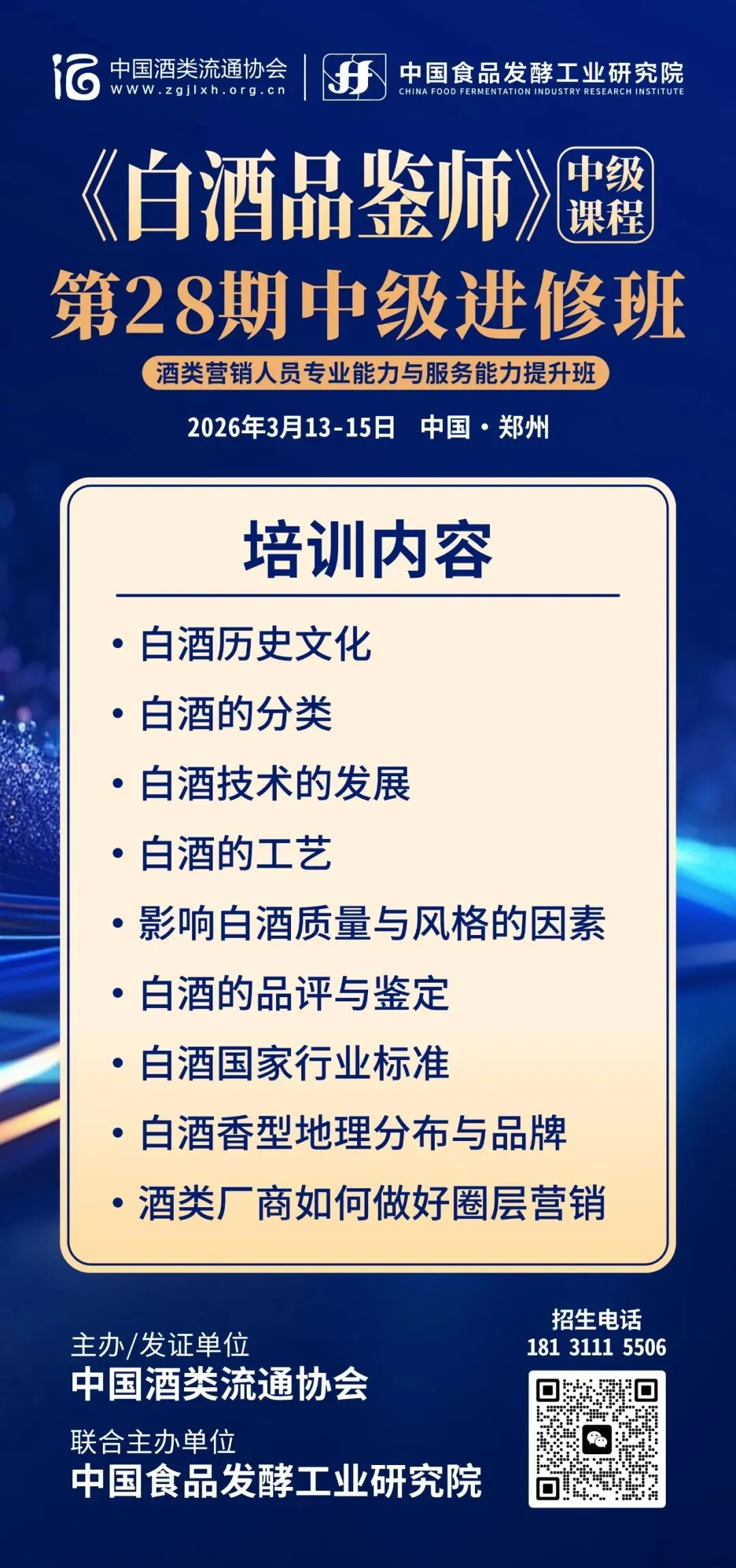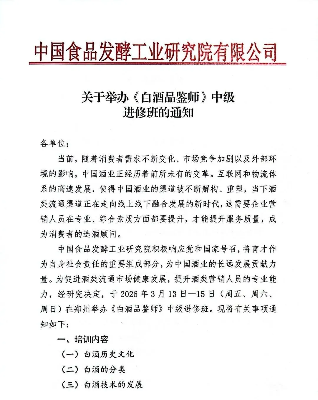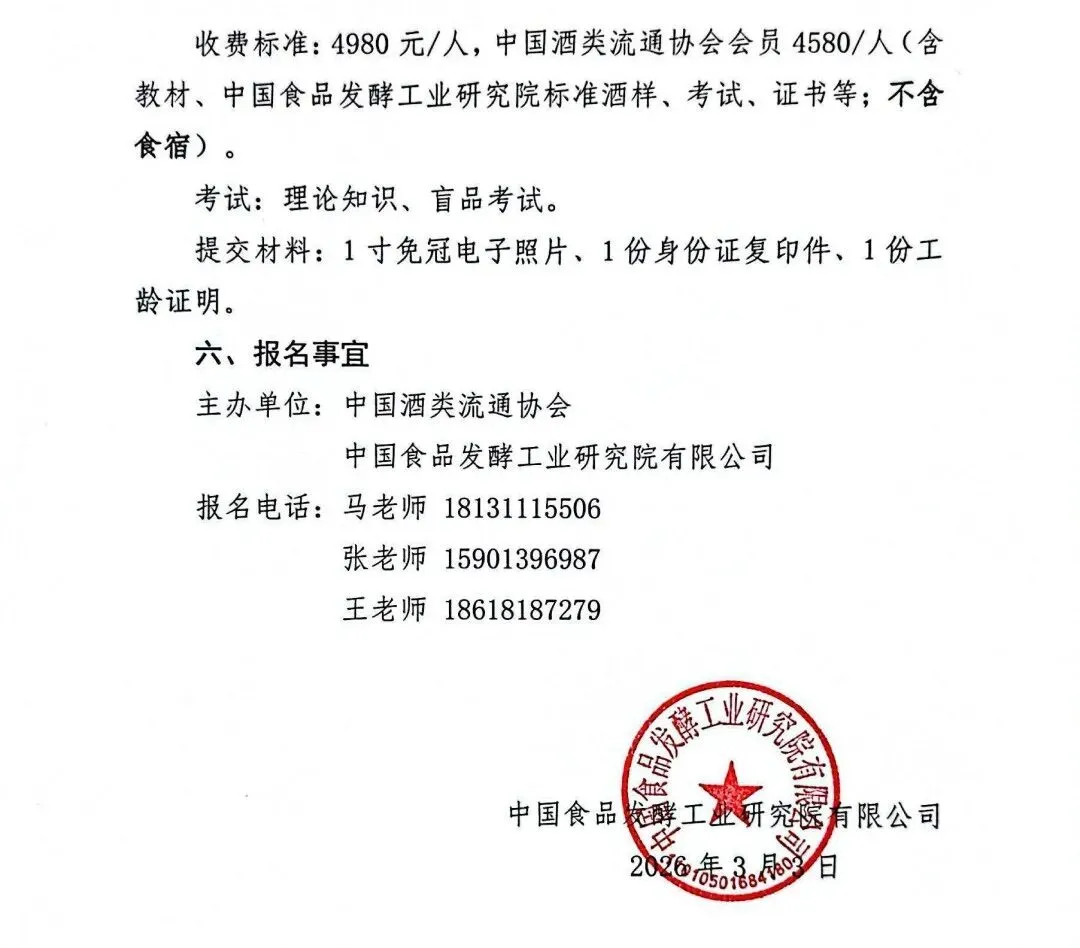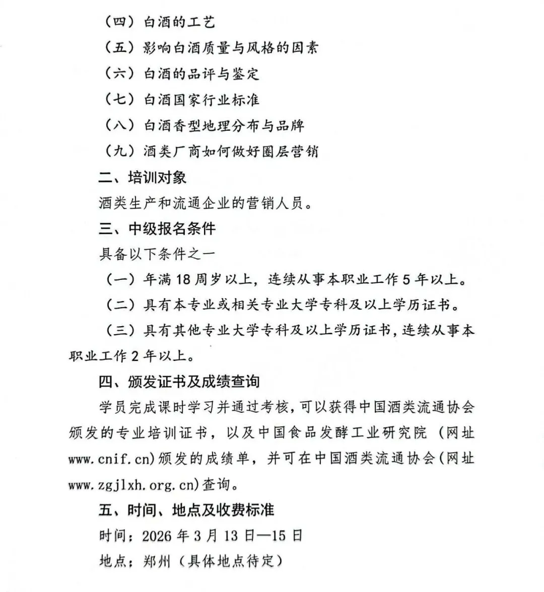 为进一步规范酒类市场秩序,推动酒类流通行业持续健康发展,全面提升酒类营销从业人员的专业素养、品鉴能力与综合业务水平,助力行业人才梯队建设与产业提质增效,经研究决定,将于2026年3月13日—15日(周五、周六、周日)在河南郑州举办《白酒品鉴师》中级进修班。
