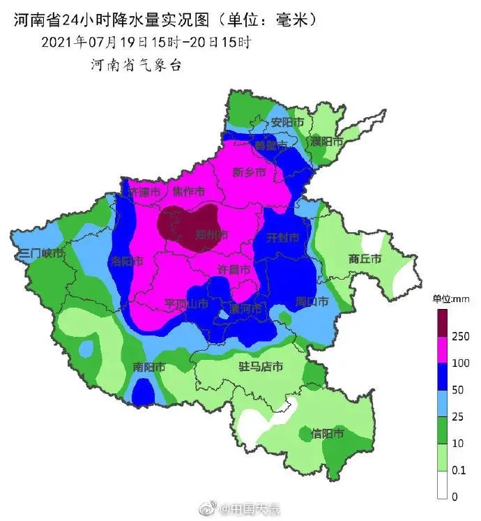 19日,河南有794个站出现大暴雨(100毫米以上),河南郑州和平顶山局地出现特大暴雨,嵩山、新密、新郑、登封、偃师5个国家级气象观测站的日雨量已突破有气象记录以来极值。