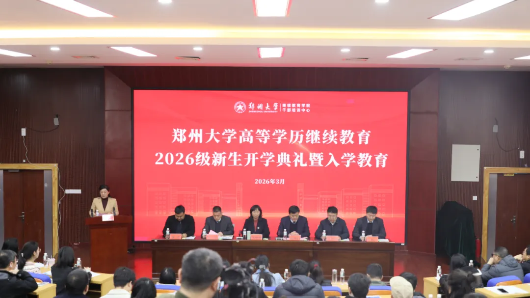 学院院长、党委副书记、中心主任张洪剑致辞。他代表学院向2026级全体新生表示热烈欢迎和诚挚祝贺,介绍了郑州大学98年的办学历史及一流大学建设最新发展成就,并重点介绍了继续教育学院在学历与非学历教育等方面的多元发展格局。他向新生提出三点希望:一是明确目标,主动转换角色,以饱满的热情投入学习;二是坚持学用结合、知行并进,真正做到学以致用、学用相长;三是坚定信念,持之以恒,为未来发展打下坚实基础。