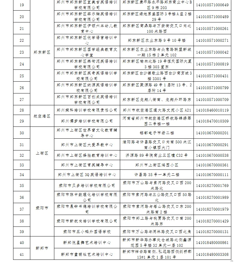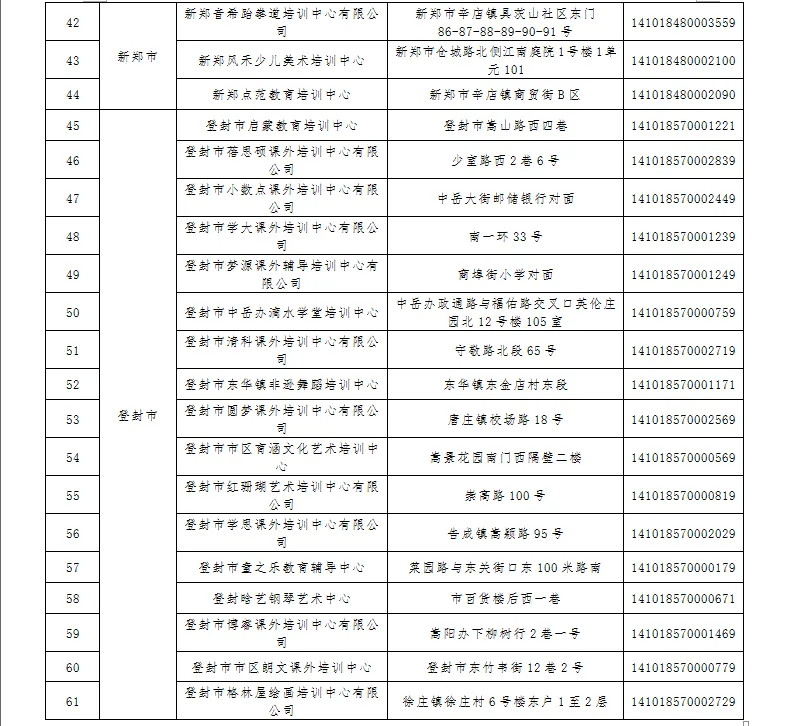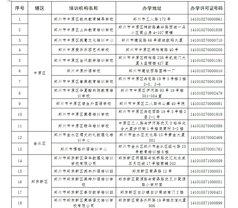 截至11月22日,依据各区县(市)教育局统计上报情况,郑州市校外培训机构经过规范化治理,有61家校外培训机构自动终止办学,停止一切办学行为,办学许可证、营业执照或民办非企业单位登记证书已注销完毕,现向社会予以公布。