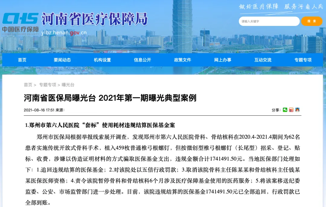 8 月 16 日,河南省医保局曝光台公布了郑州市第六人民医院「套标」使用耗材违规结算医保基金案。该院骨科主任陈某某和骨结核科主任钱某某医保医师资格被取消,并被责令暂停骨科和骨结核科 6 个月涉及医疗保障基金使用的医药服务。