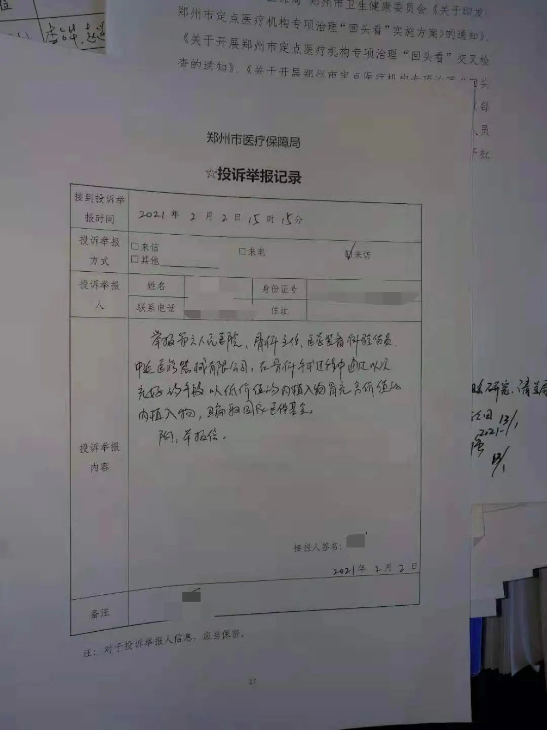 该举报信称,郑州市第六人民医院骨科主任和神经外科主任涉嫌在外科手术过程中,将低价值的内植入物替代高价值的内植入物,植入病人体内(简称为「套标」行为)。