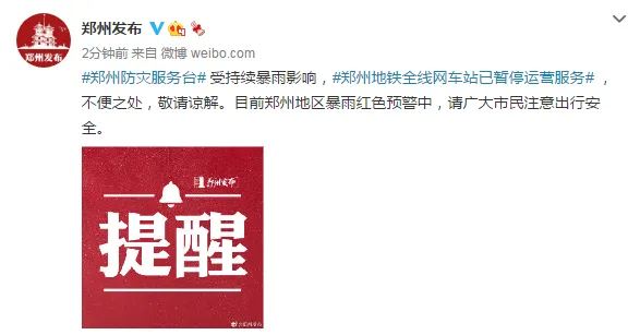 郑州市政府紧急提醒市民,此次郑州遭遇的是多年不遇的强降水,形势严峻。请市民尽量待在家中或者安全的地方,注意观察周边环境,提高防水、防电、防灾、避险、自救能力。