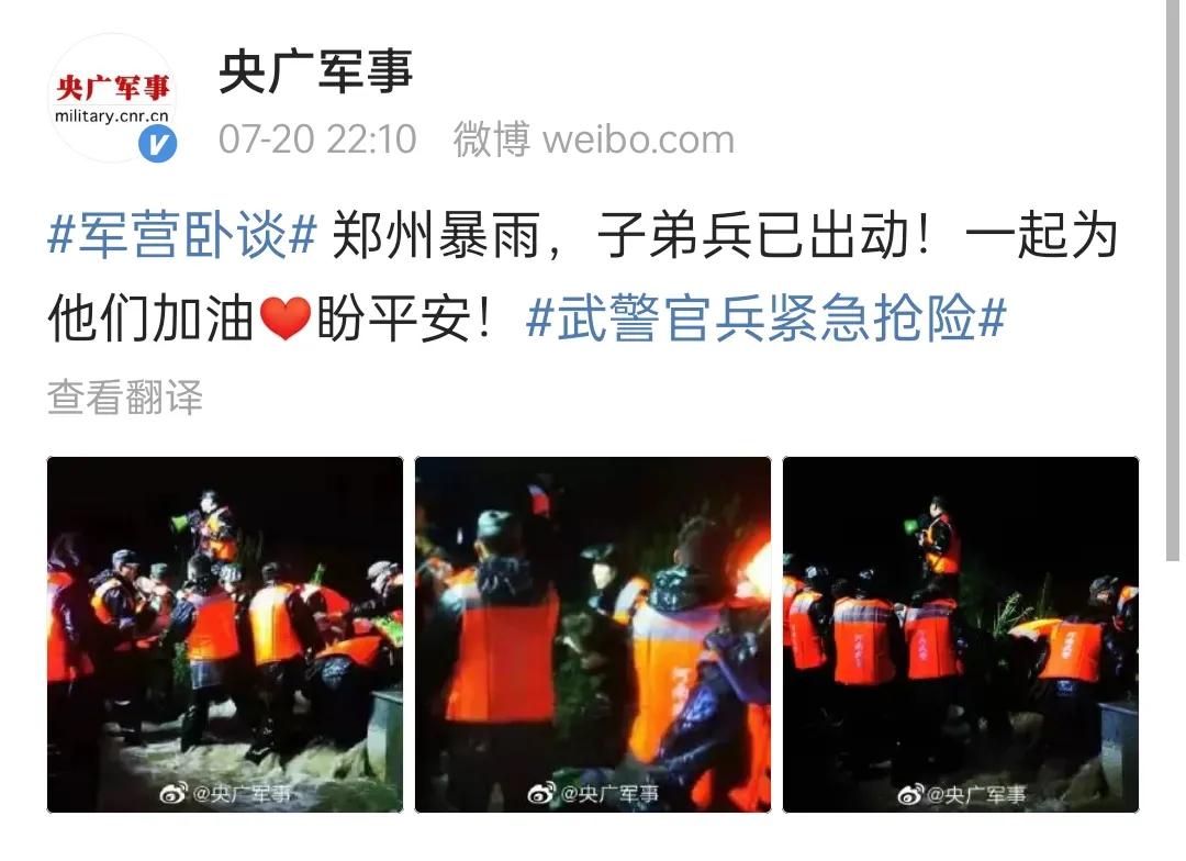 另@央广军事 微博消息:7月20日,武警河南总队郑州支队出动150余名官兵,携带皮划艇、救援装备5800余件,紧急参与抢险救援任务。安全归来!