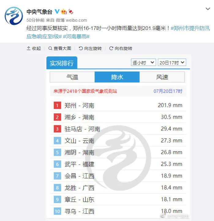 另据@中央气象台 20日消息,“经过同事反复核实,郑州16-17时一小时降雨量达到201.9毫米!”