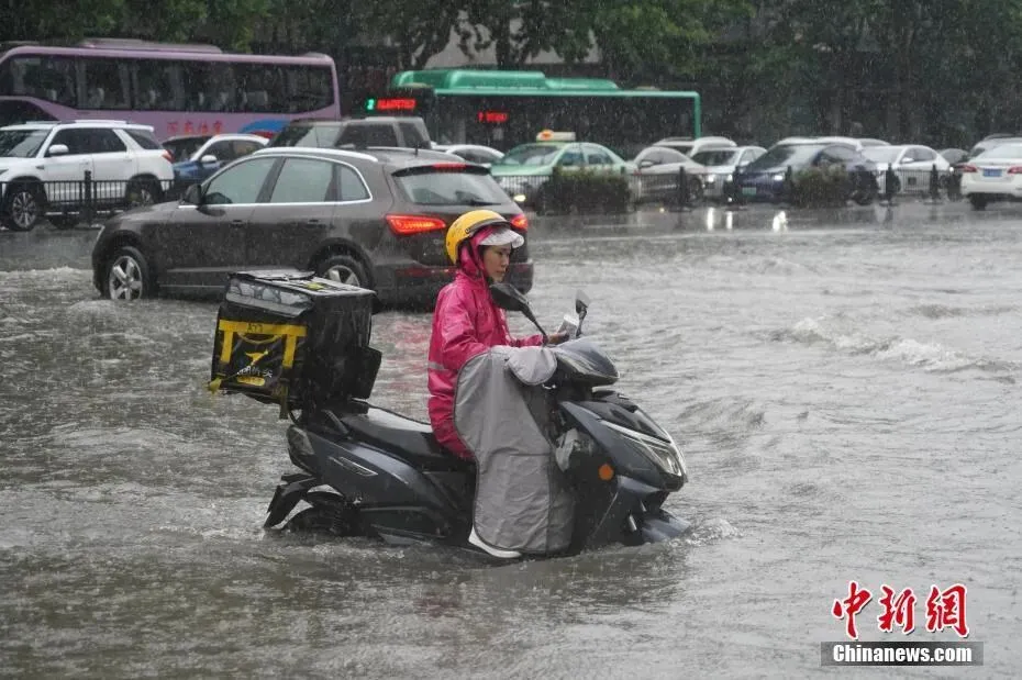 7月20日,外卖员冒雨送餐。中新社记者 阚力 摄