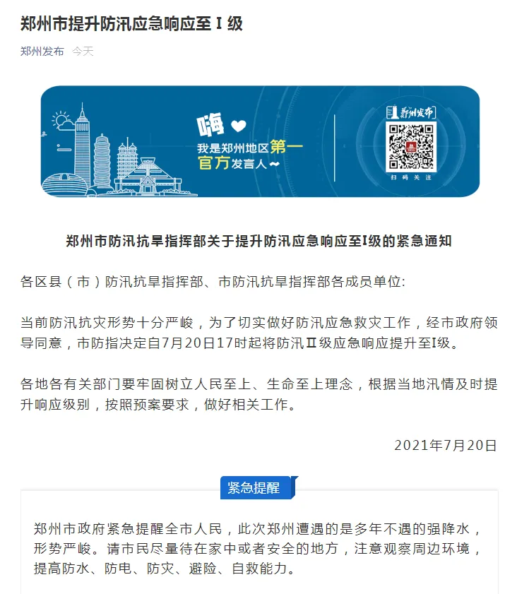 郑州市防汛抗旱指挥部20日发布紧急通知,提升防汛应急响应至I级。