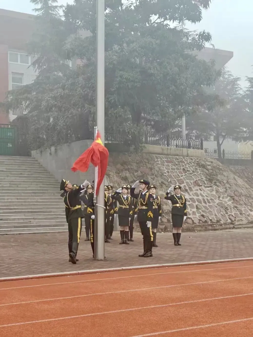 升旗仪式严格按照流程有序进行。随着“准备”口令下达,全体师生迅速整队肃立,以严谨的姿态迎接仪式开始。第二项,奏国歌、升国旗。雄壮的《义勇军进行曲》响彻校园,鲜艳的五星红旗迎着晨光缓缓升起,全体师生面向国旗行注目礼,齐声高唱国歌,现场氛围庄重肃穆,充满了对祖国的崇敬与热爱。